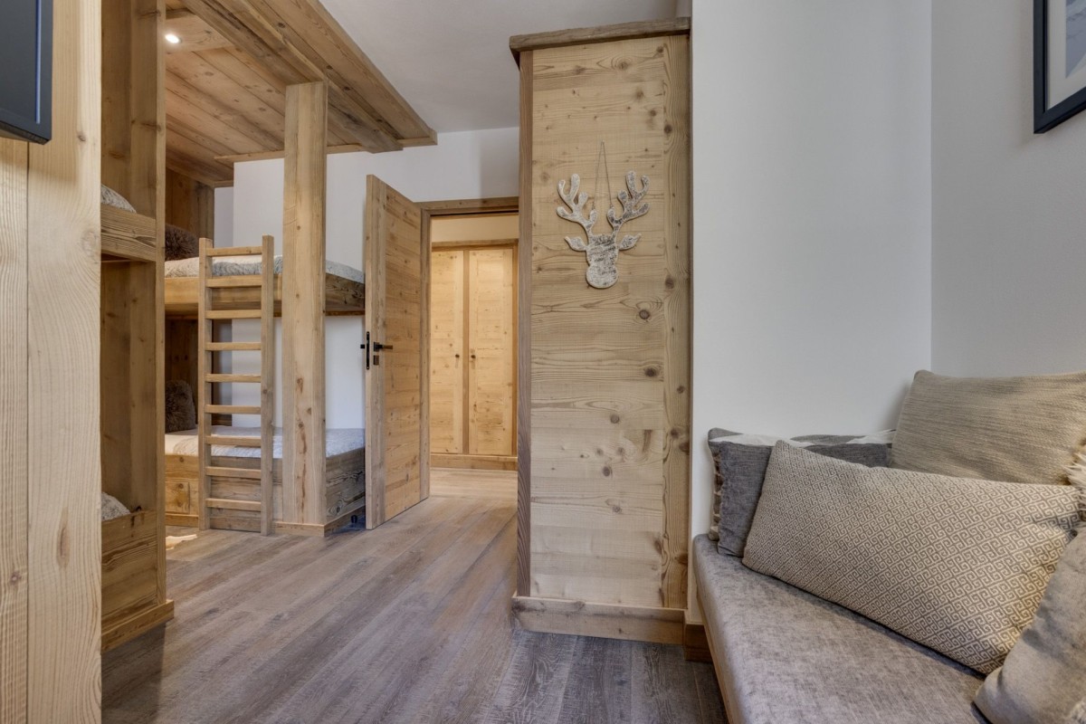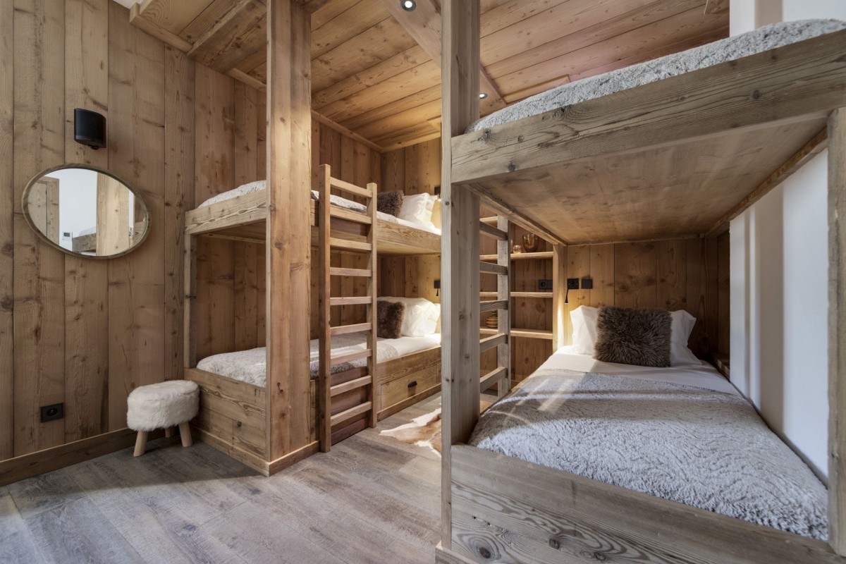 On the lower floor, four distinctive bedrooms provide privacy and comfort, each with its own bathroom and an additional WC. Three ensuite king rooms have direct terrace access, and the master suite features a roll-top bath with mountain views. The adult-sized quad bunk room, complete with a TV snug and private bathroom, is ideal for children or extra guests. Thoughtful amenities include Smart TVs, a Sonos sound system, Bluetooth speakers, a DVD player, WiFi throughout, laundry facilities, and two indoor parking spaces with electric charging. A cot and high chair are available on request.