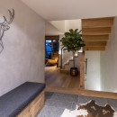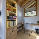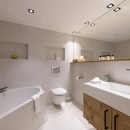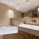 On the top floor, the master suite is an airy, open-plan space featuring a luxurious bathtub, ample natural light, and a tranquil atmosphere. A small study area and an additional shower room are also found on this level.