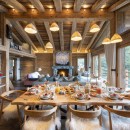The welcoming living space on the top floor is open-plan and features a double-height vaulted ceiling, creating an airy feel with a cozy chalet atmosphere, thanks to the exposed timber throughout. The stylish interior design includes a dining table seating eight with lovely Scandinavian-style wishbone chairs, and plush sofas arranged around a rustic stone fireplace. Staggered pendant lampshades add a warm ambiance to the dining area, perfect for memorable dinners. A convenient guest WC/shower room on this level makes it ideal for entertaining.
