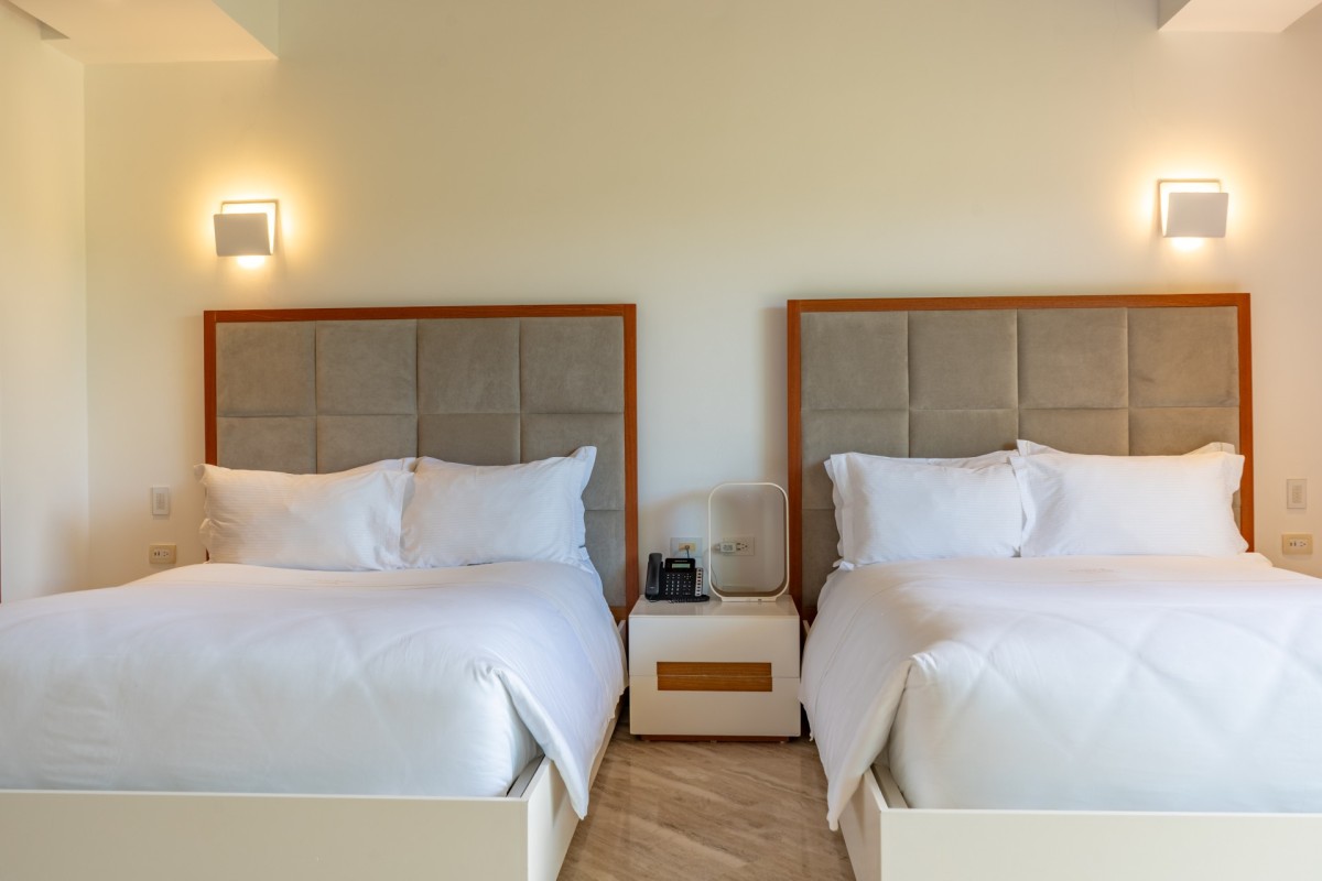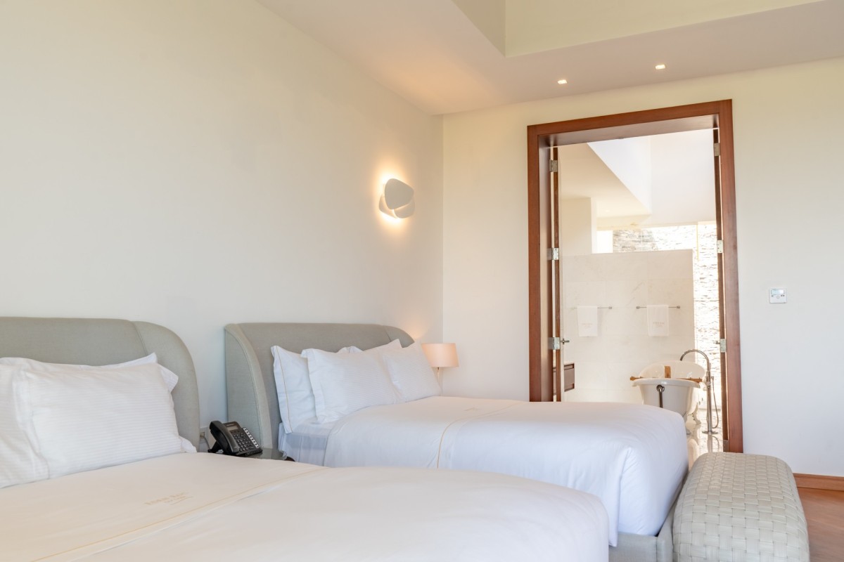 Bedroom 2: Second floor bedroom with two queen-size beds, A/C, TV, WiFi, sea view, terrace, and en-suite bathroom with bathtub, shower, double vanity and WC. 2 guests maximum.