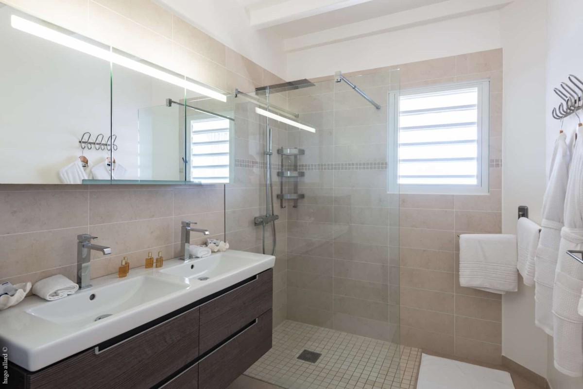 Bedroom 3: Lower level Bedroom with two single beds (can be made up as a king-size bed), A/C, ceiling fan, WiFi, safe, walk-in closet, private terrace, ocean view, and en-suite bathroom with shower, double vanity and WC. 2 guests maximum