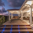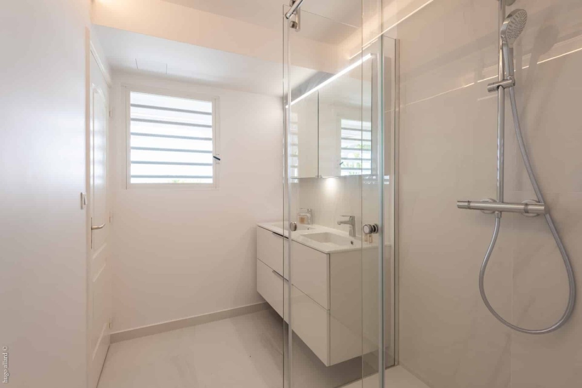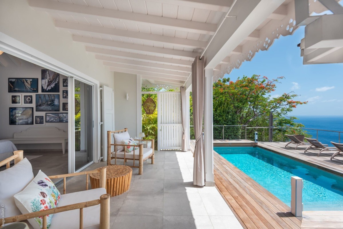 At the front of the villa, the terrace opens onto a breathtaking view of the ocean, harbor, Shell Beach, and the endless horizon that glows golden each evening at sunset. Under the covered area, an outdoor lounge set in woven fibers and an al fresco dining table for six invite you to relax and share delicious meals. A few steps down, another modern table offers a quiet corner for conversation while taking in the magnificent scenery. On the wooden deck, the private pool sparkles under the Caribbean sun, surrounded by sun loungers that promise serene moments of rest and privacy.