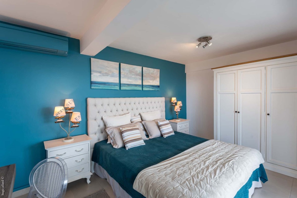 Bedroom 1: Main level Bedroom with two single beds (can be made up as a king-size bed), A/C, ceiling fan, WiFi, safe, walk-in closet, private terrace, ocean view, and en-suite bathroom with shower, double vanity and WC. 2 guests maximum