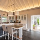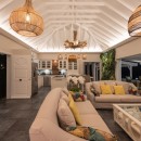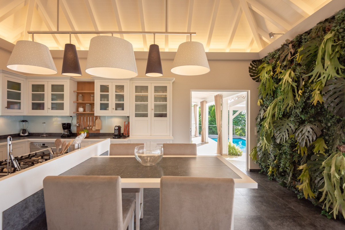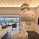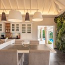 Spread across several levels, villa Ti Moun is a true sanctuary of peace, filled with natural light and cooled by gentle trade winds. Overlooking a sweeping panorama from Gustavia’s harbor to St-Jean Bay, the villa features an exceptionally comfortable living room with plush sofas beneath a high vaulted ceiling, creating an airy and spacious feel. The combination of driftwood accents and soft off-white hues evokes a calm, coastal elegance. Next to the lounge, the fully equipped kitchen includes a central island with a breakfast counter—perfect for casual bites or morning coffee. Through large glass doors, the stunning ocean view floods the space with light and tranquility.