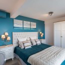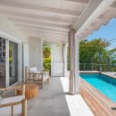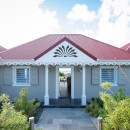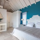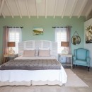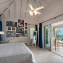 The villa’s three air-conditioned bedrooms each have their own en-suite bathroom and stunning ocean views. Two bedrooms are located on the main level—one opening directly to the pool under charming Caribbean gingerbread trim—and both can be configured with twin or king beds. The third bedroom is on the lower level and features twin beds along with its own private terrace. The décor throughout blends maritime touches in shades of deep blue and seafoam green, complemented by whitewashed or upholstered headboards, enhancing the soothing, refined atmosphere. Guests also have access to a well-equipped fitness room during their stay.