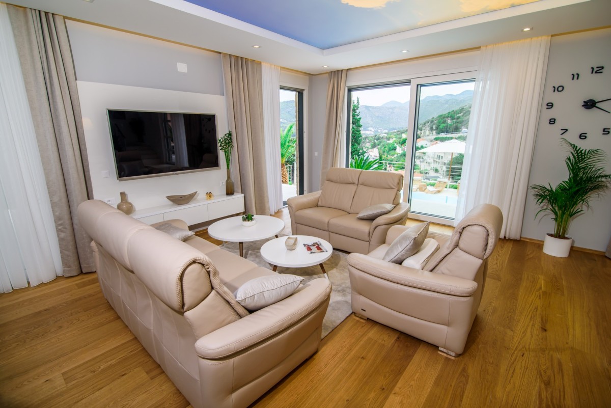 Cozied up against a rugged hillside, Villa Toni is nestled among some of the finest private villas in the exclusive Stikovica area. Just a twenty-minute drive from vibrant Dubrovnik, the villa offers a sense of peaceful seclusion, defined by tranquility, privacy, and the shimmering turquoise Adriatic Sea. Clean, modern architectural lines frame five double bedrooms, comfortably accommodating up to ten guests. Inside, a soothing neutral palette invites you to unwind and take in the sweeping views of graceful Zaton Bay and its dramatic karst backdrop. Thoughtful, cozy details throughout ensure that every moment is an opportunity to relax.