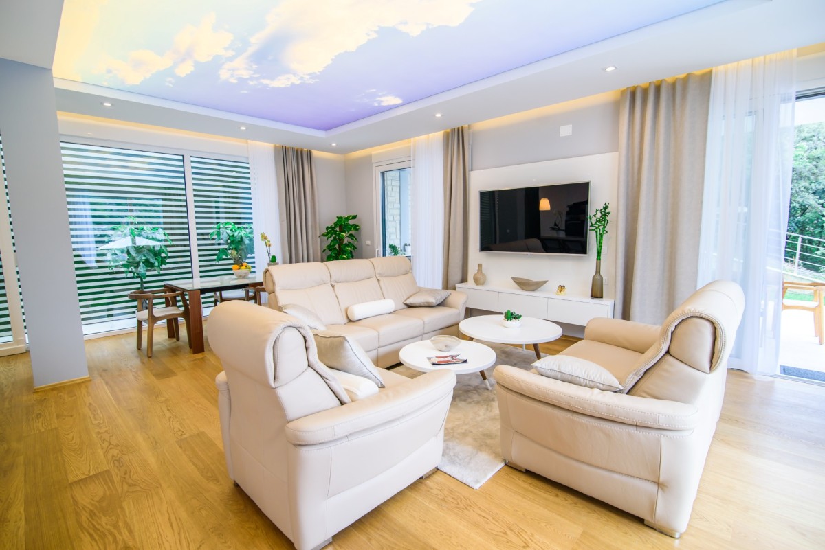 Spanning 350 m² indoors and 120 m² outdoors, Villa Toni sits at the top of a terraced property that descends toward the road, where a private garage with two parking spaces awaits ideal for guests traveling by car.