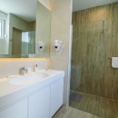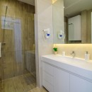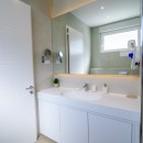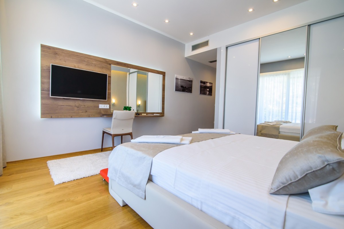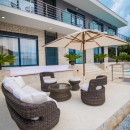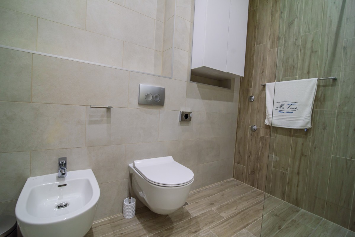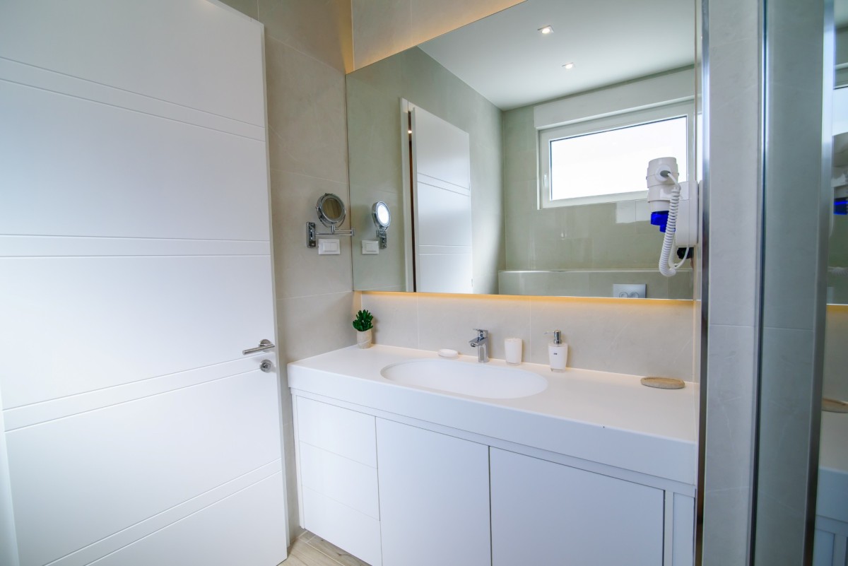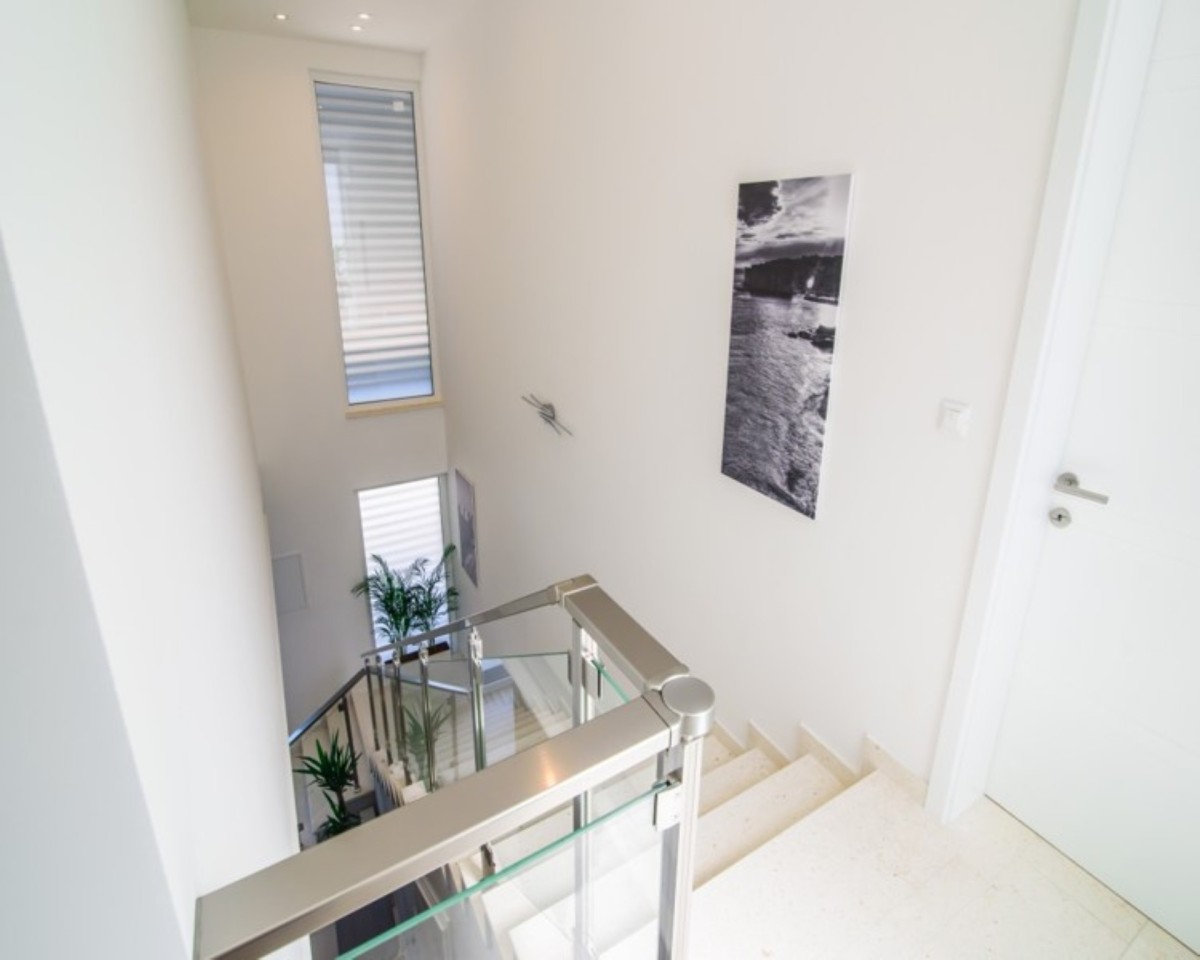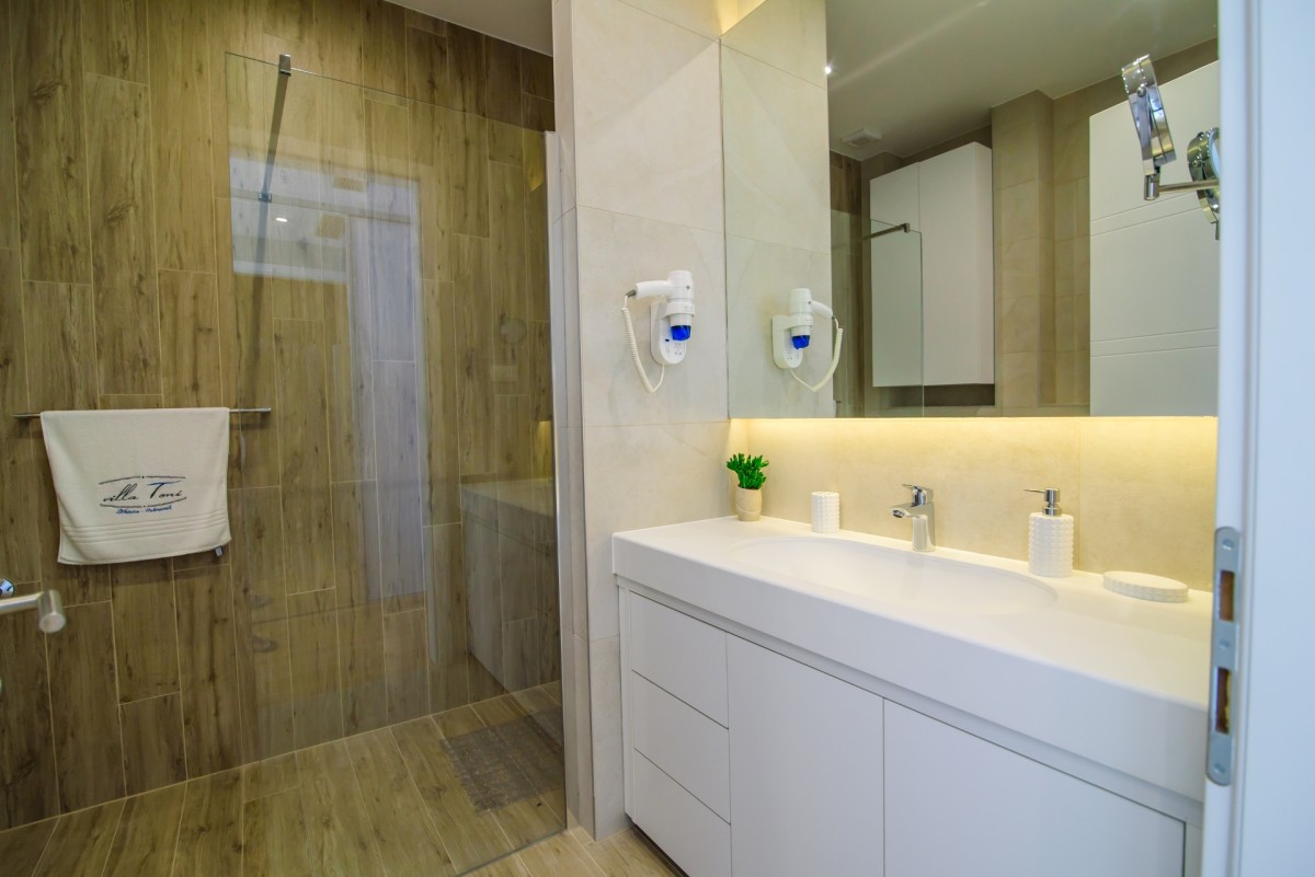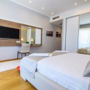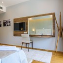 Villa Toni features five bedrooms. One is located on the ground floor behind a discreet passage near the kitchen, which also hides a small service area with a laundry room and guest toilet. The remaining four bedrooms are on the upper floor. Each offers a comfortable, cohesive design, an en-suite bathroom with a walk-in shower, a private balcony, and convenient amenities such as large closets and vanity tables making them feel quickly like a home away from home.