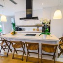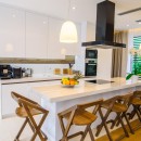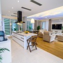 Behind it, the ground floor seamlessly blends with the outdoors. The open-concept living space includes a fully equipped kitchen, dining area, and living room. High ceilings and large sliding glass doors flood the area with natural light, while soft tones, a lush green accent wall, and a sky-blue ceiling create an atmosphere of calm. Prepare a snack, then settle into the leather armchairs to enjoy a match on the oversized LCD TV but be prepared to do most of your cooking outside.