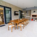 Embracing a cherished local tradition of cooking and dining together, a shaded side terrace offers an outdoor kitchen complete with a fireplace, stove, and sink, as well as a dining table for ten. Another large TV ensures you never miss a moment. Overlooking carob and olive trees, this space guarantees complete privacy and is perfect for quality time.