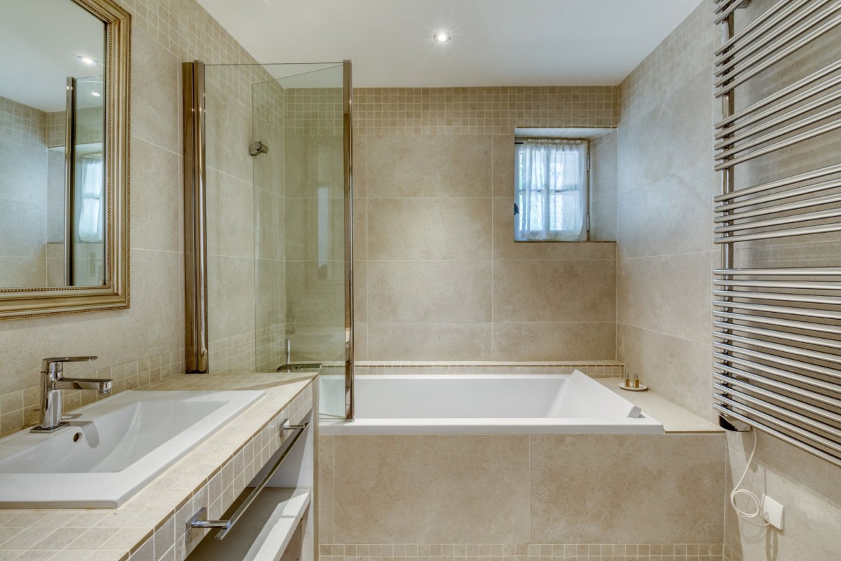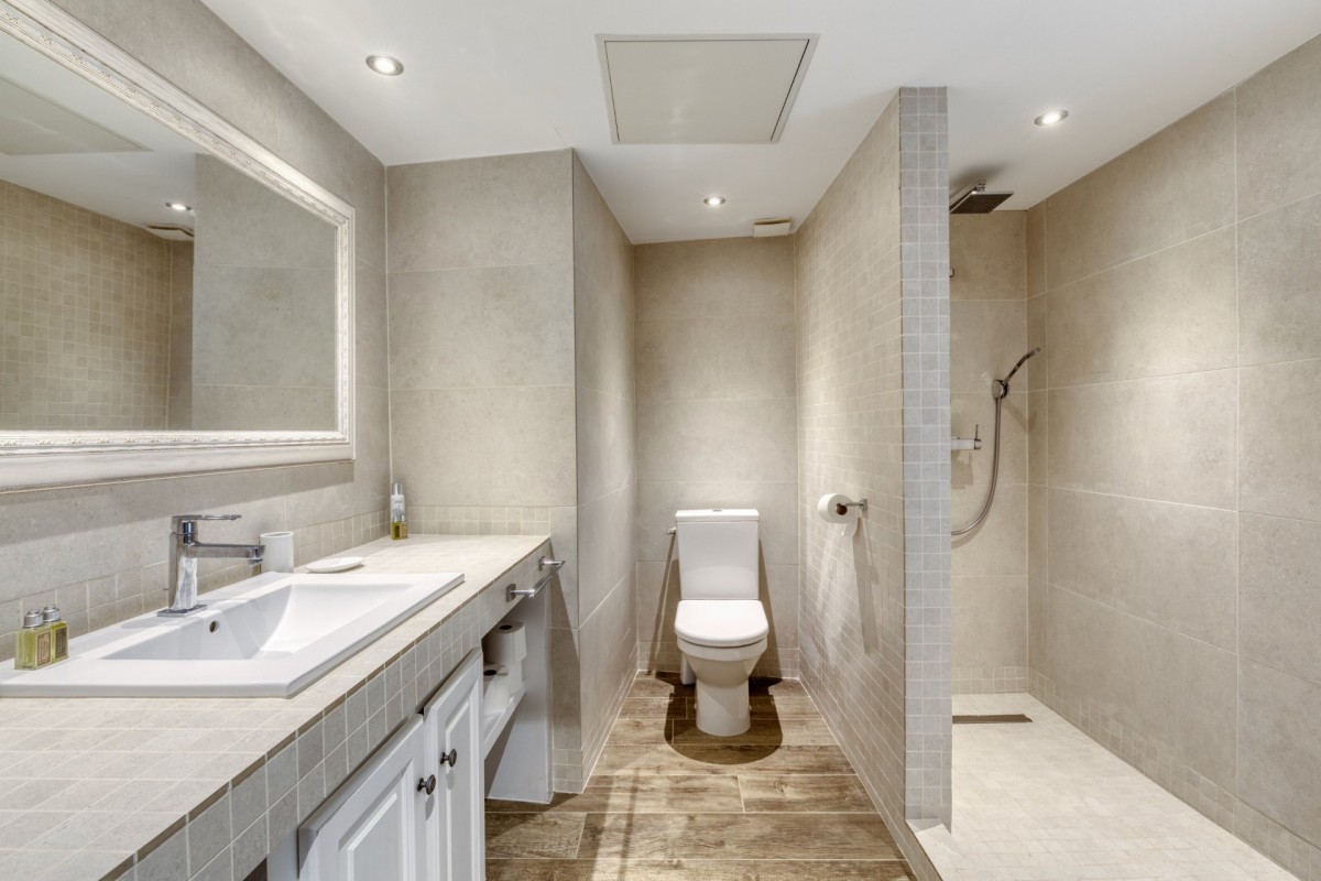 Bedroom 6: Ground floor bedroom with a queen-size bed (can be made up as 2 single beds), under-floor cooling system and en-suite bathroom with bathtub, vanity and WC. 2 guests maximum.