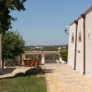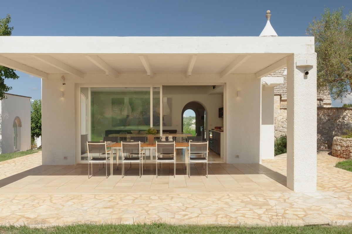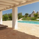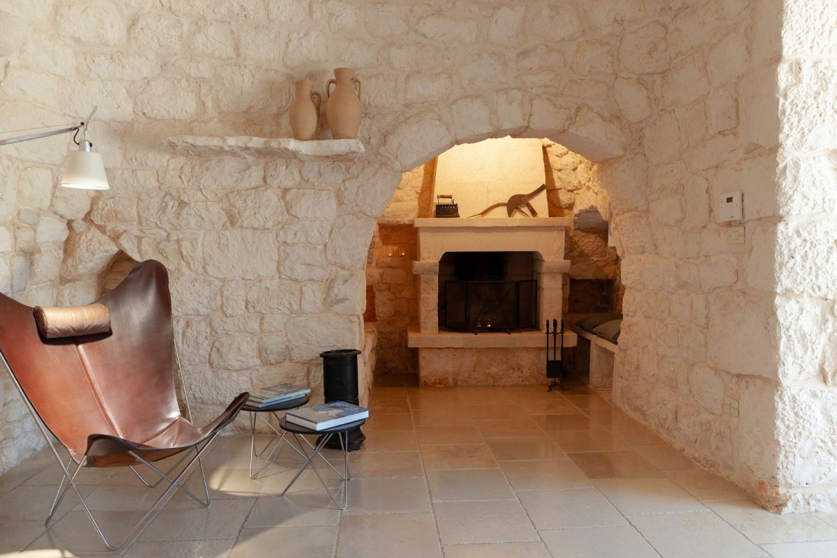 Here, rural charm meets modern comfort. Ideal for families or groups of friends, Trulli Lucia can host up to 12 adults and 8 children. The main residence, sensitively renovated to preserve local tradition, features three trulli cones that open into a cosy living area and a fully equipped kitchen. A spacious dining room with large windows overlooks the veranda among olive trees, where an additional outdoor table invites guests to enjoy meals in the open air. Comfortable lounges, including one with a fireplace, offer inviting spaces to unwind.