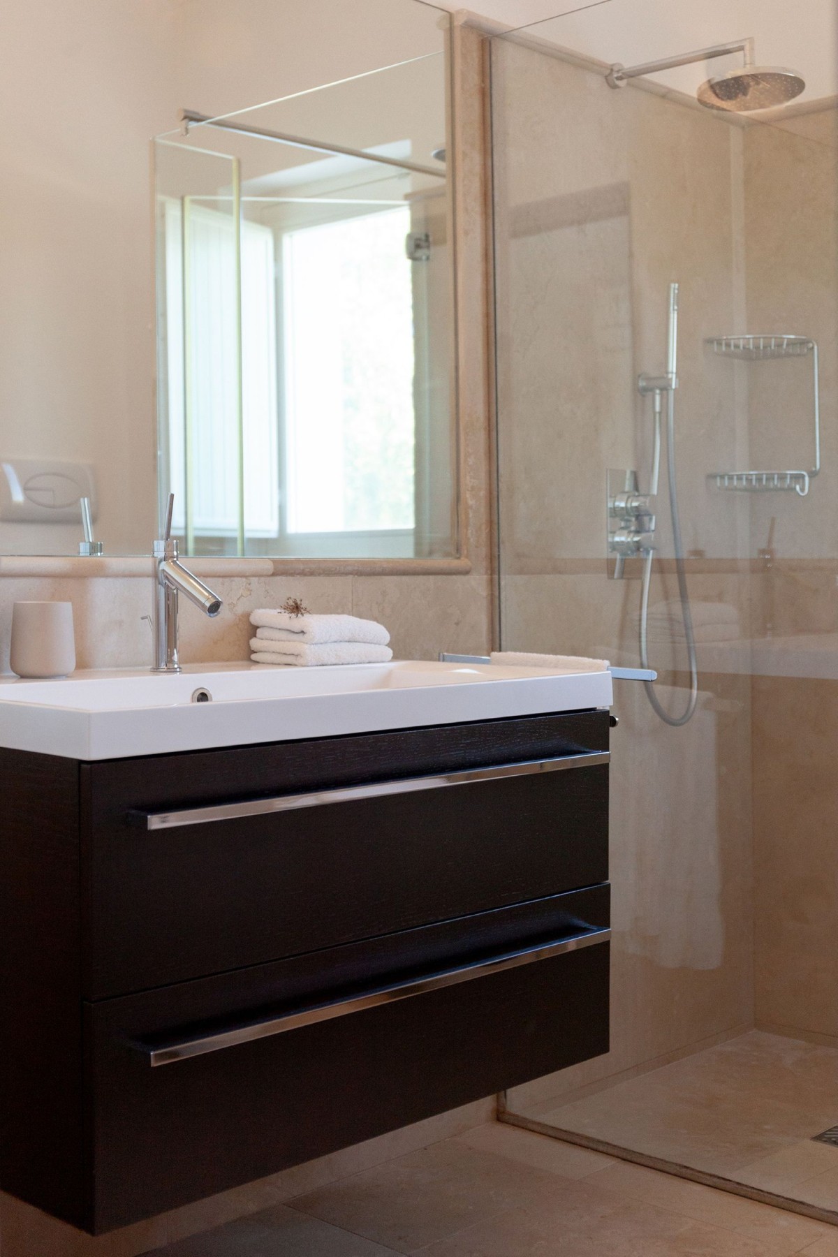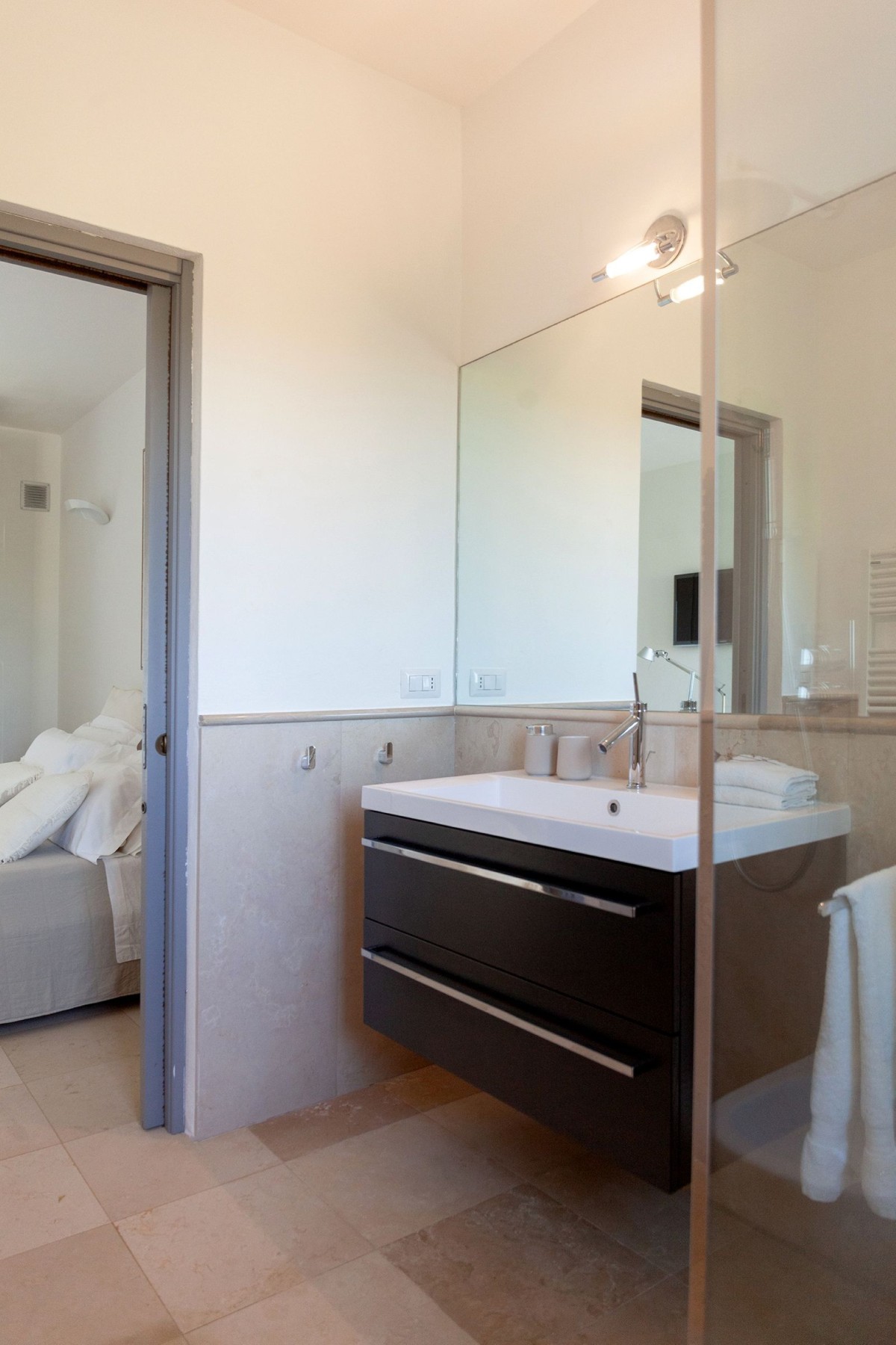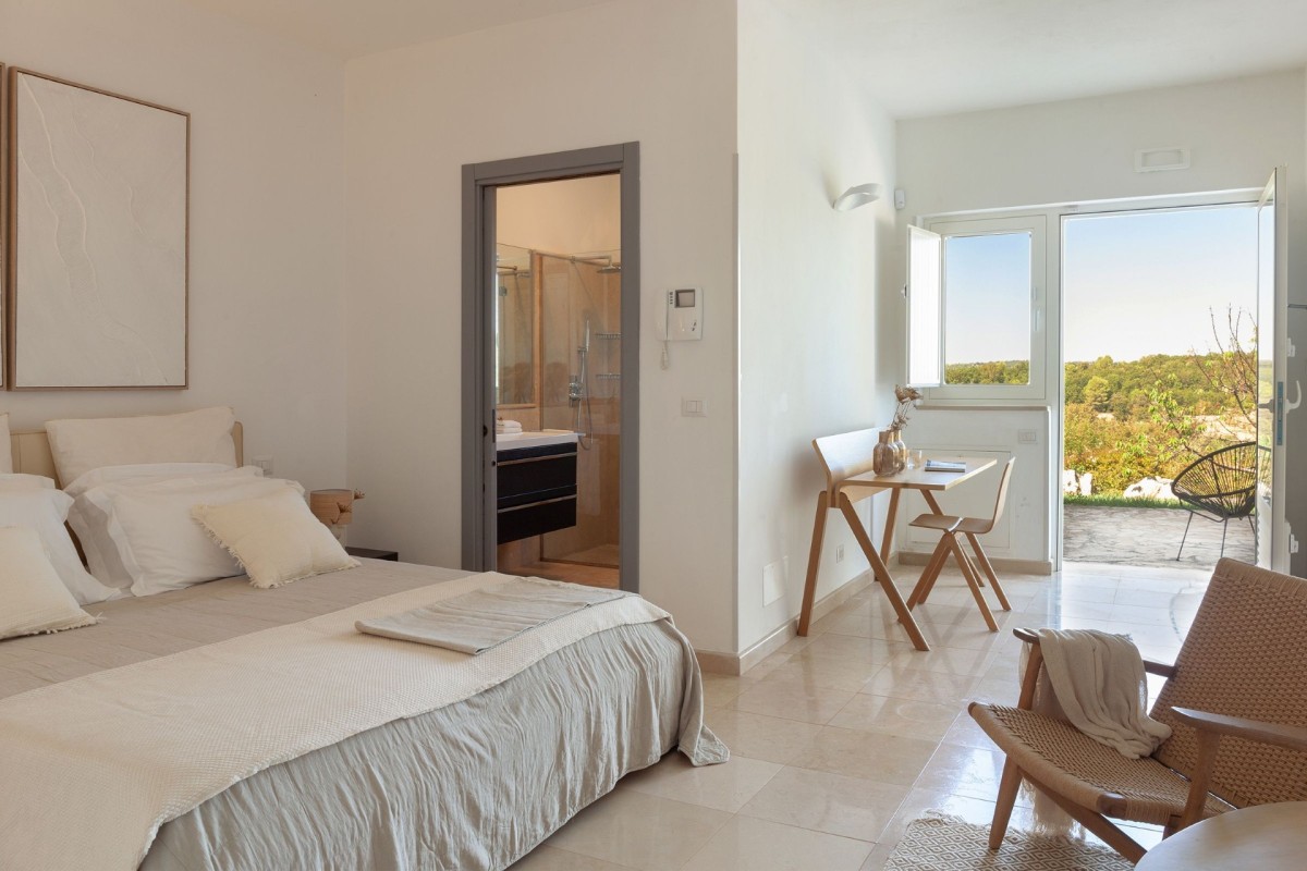 A central living area with sofas and a fireplace creates a warm gathering spot, while a second room with a sofa, desk, and TV makes an ideal reading or working space. These share a modern bathroom with a shower. Two independent suites each feature a queen-size bed and private bathroom, while four more suites near the pool offer stunning countryside and Cisternino views. All rooms have private entrances, modern amenities, and generous space.