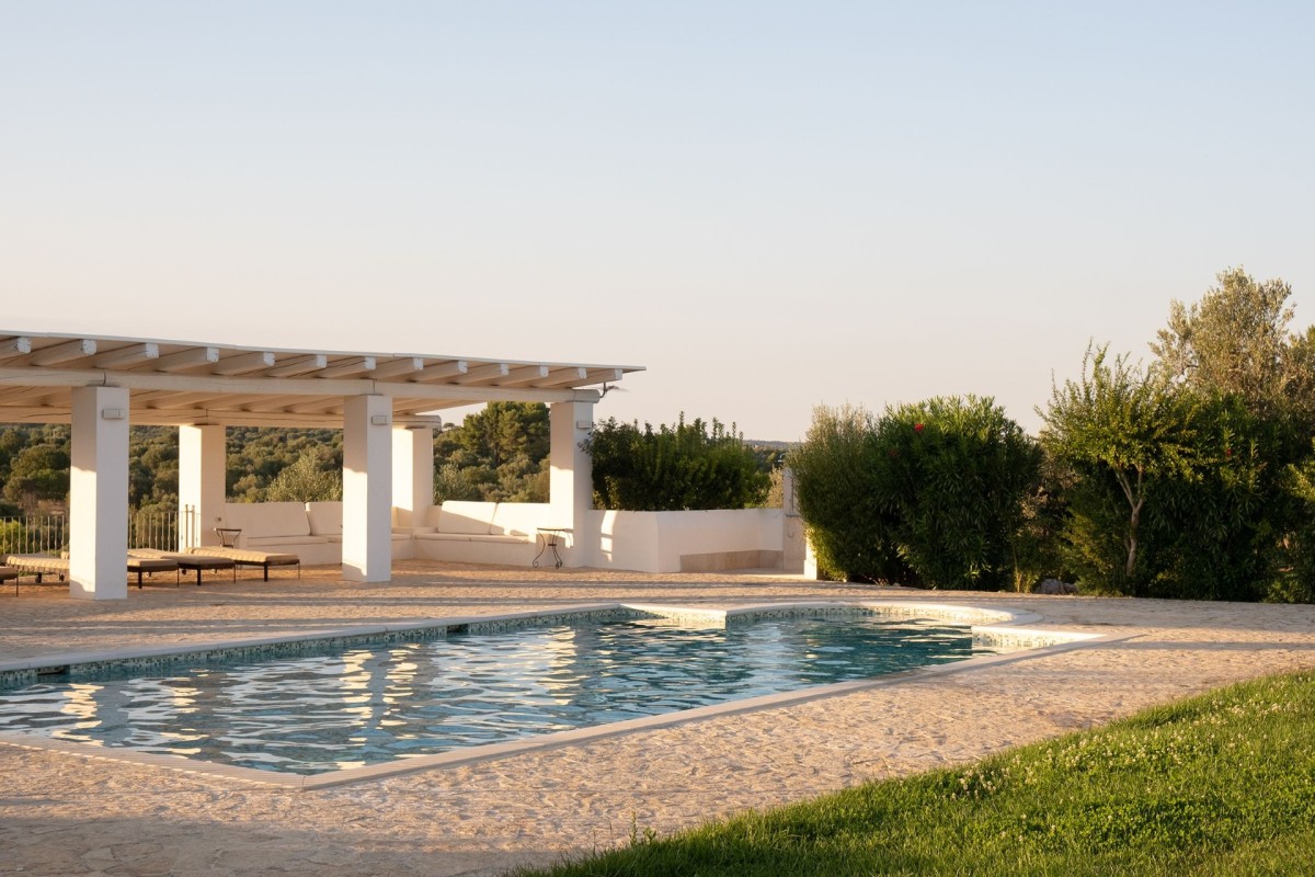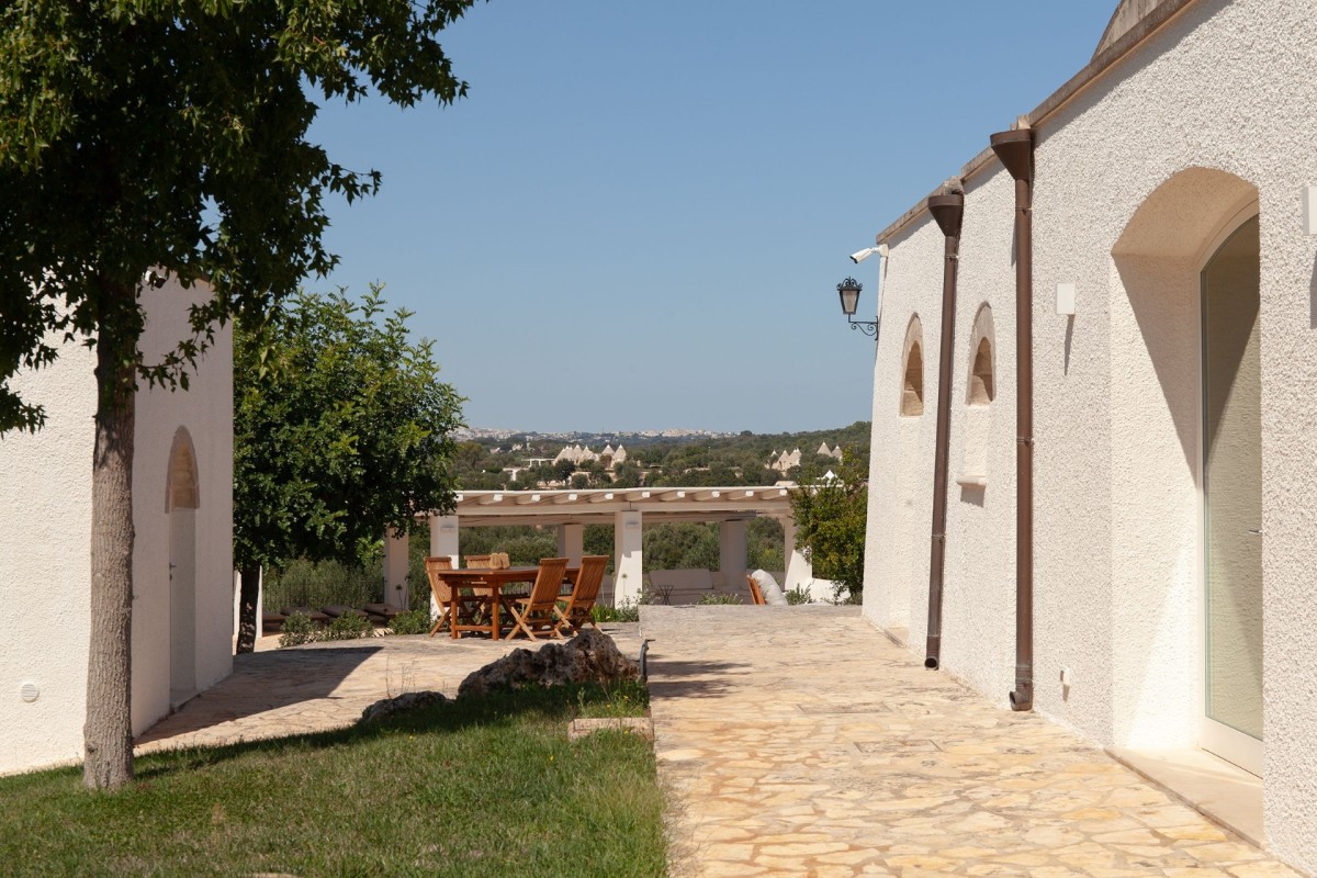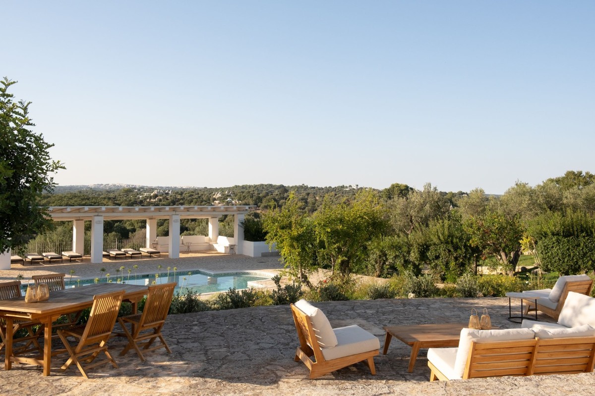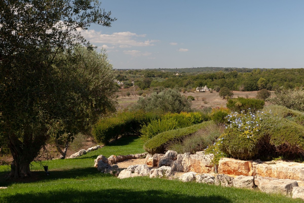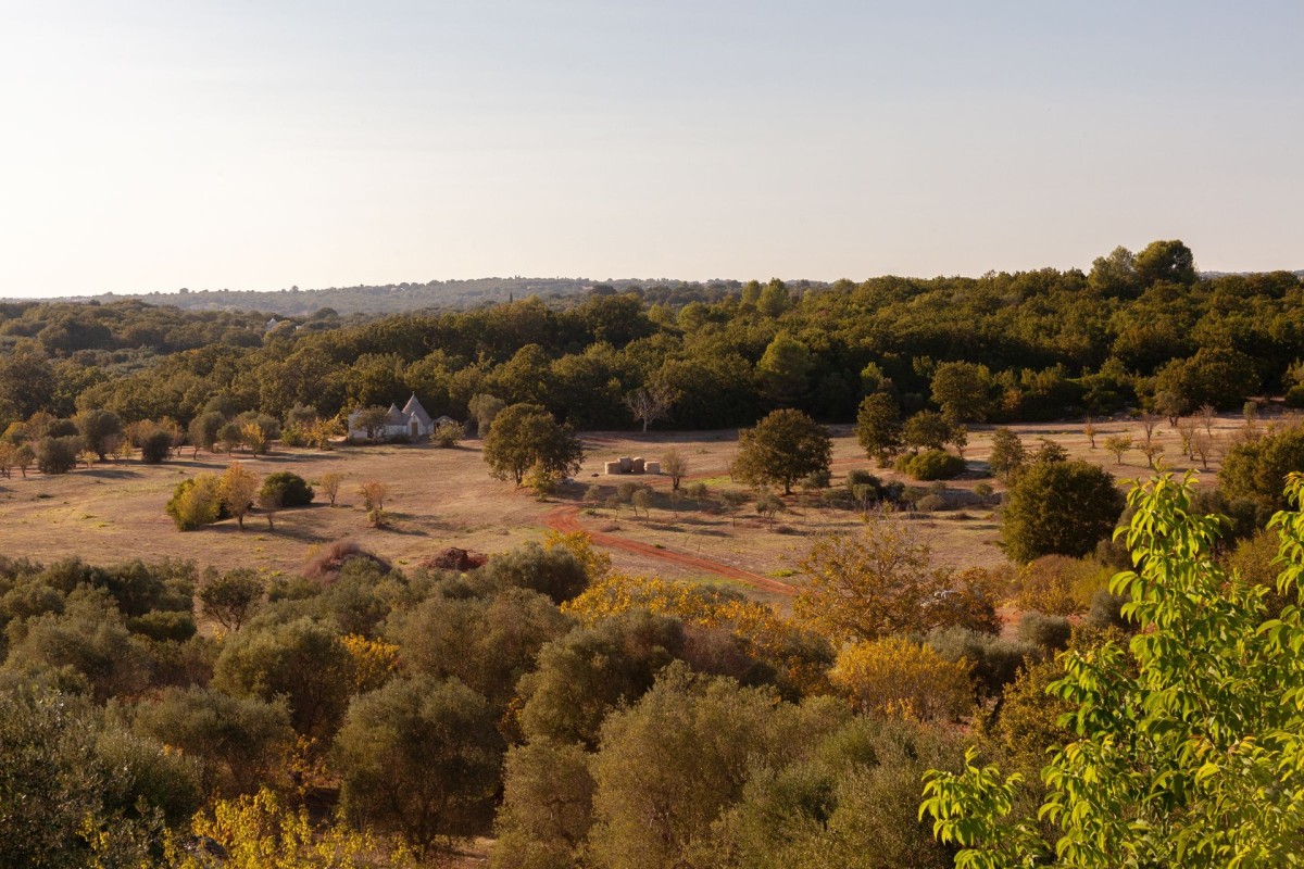 In the heart of the Itria Valley, Trulli Lucia is a tranquil retreat immersed in the Puglian countryside, yet close to the lively towns of Ceglie Messapica and Cisternino. At sunset, the softly lit panorama reveals rolling hills that frame the property in a magical, relaxing atmosphere.