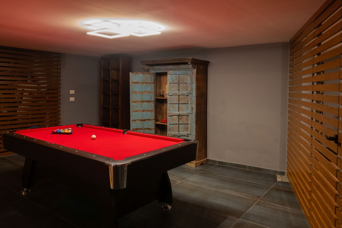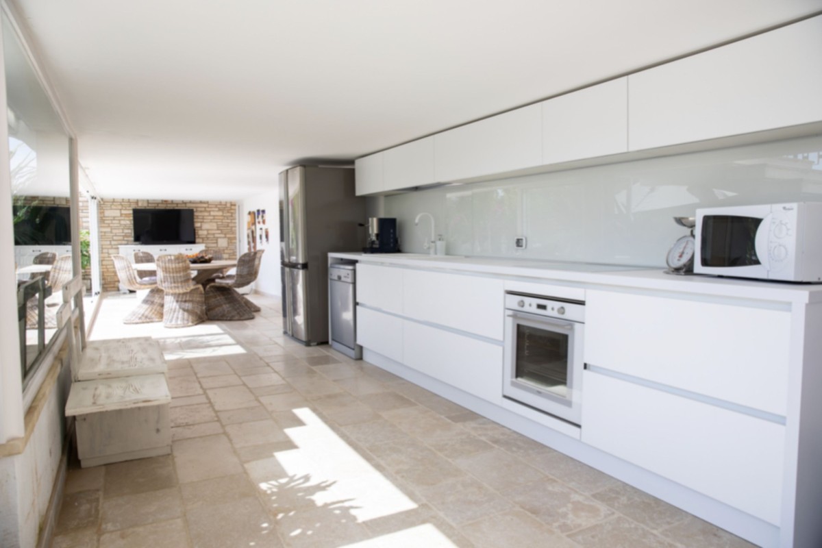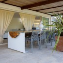 On the ground floor, facing the main pool, there is a covered outdoor kitchen enclosed with fully opening windows, seamlessly connecting to the garden. It is equipped with a sofa, TV, refrigerator, oven, induction hob, dishwasher, utensils, coffee machine, electric kettle, and a bathroom with a shower.