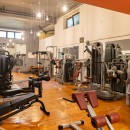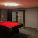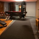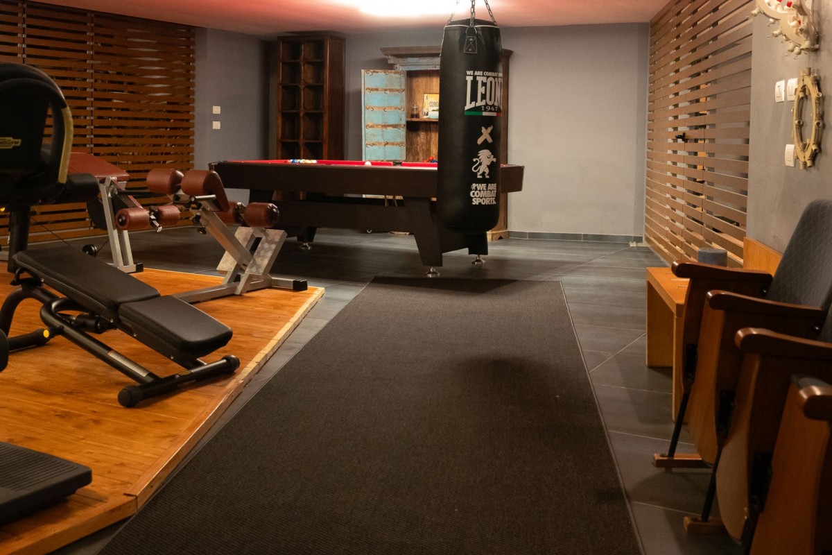 In the basement, guests can enjoy a large gym with exercise equipment and a billiards table.