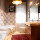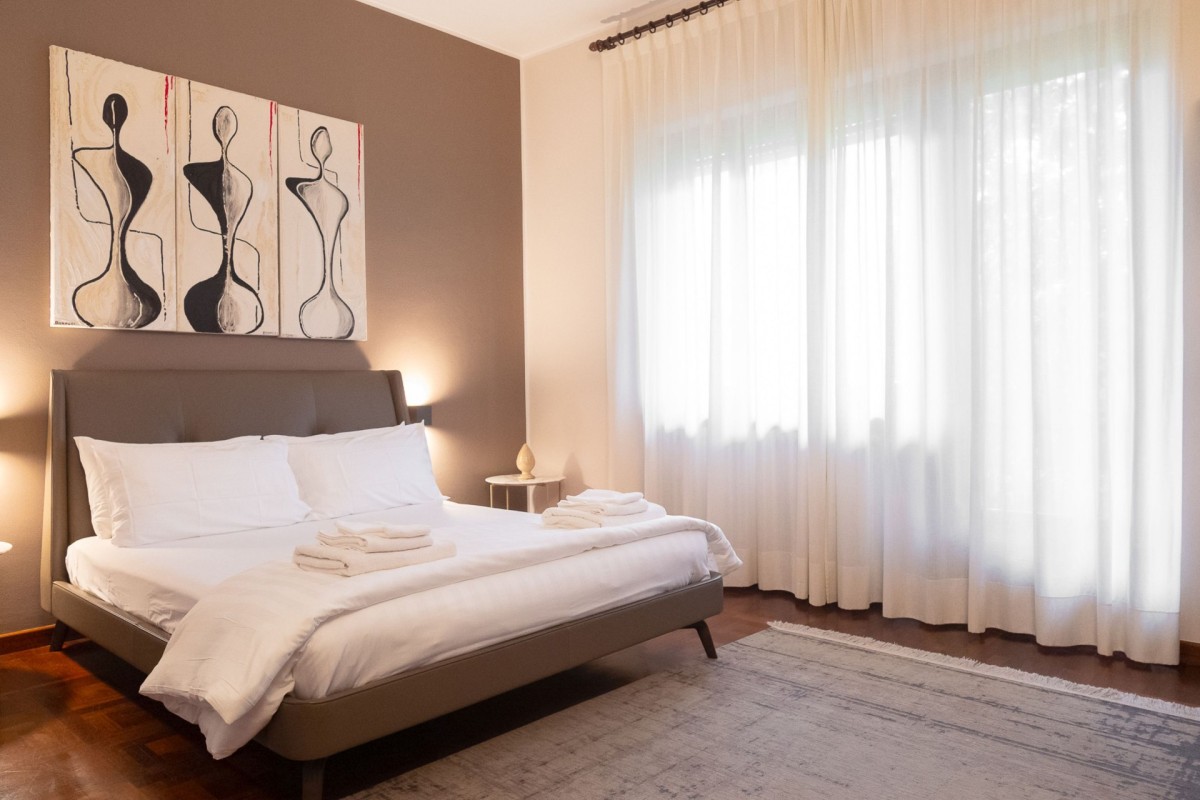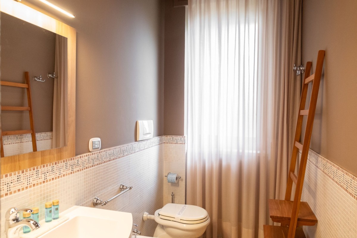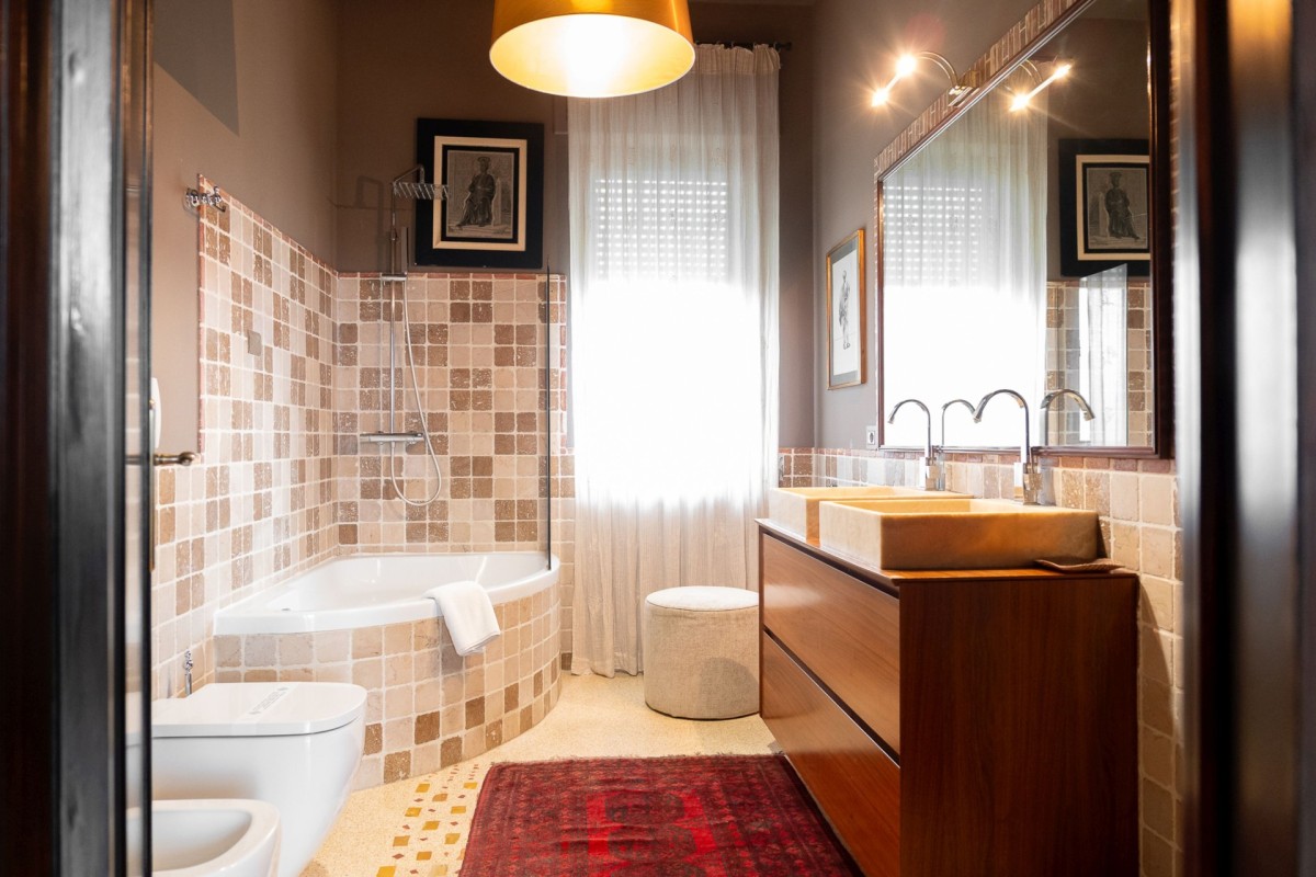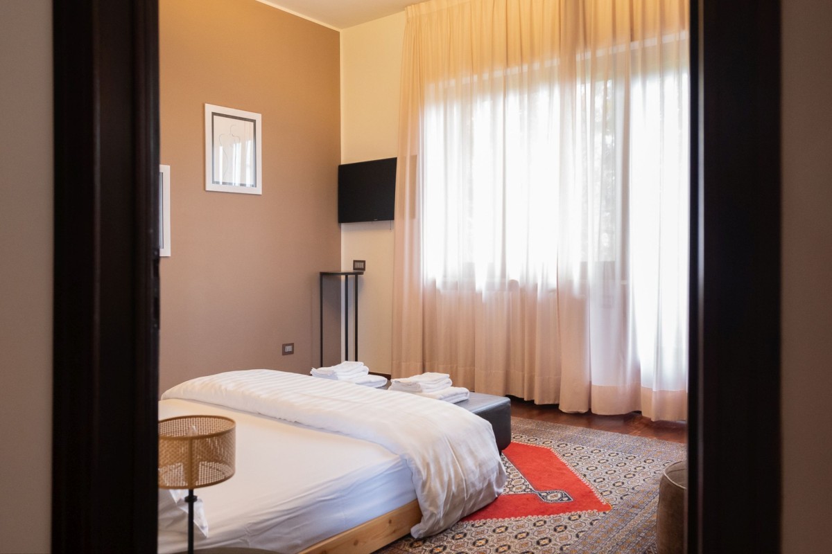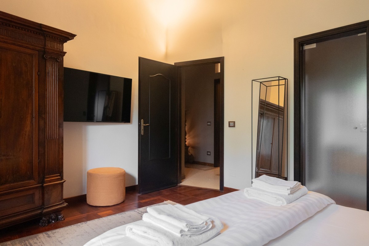 Bedroom 4: First floor bedroom with a double bed, A/C, WiFi, TV, access to terrace, garden view, and shared bathroom with bathtub, vanity, bidet, and WC. 2 guests maximum.