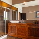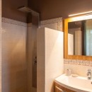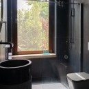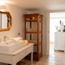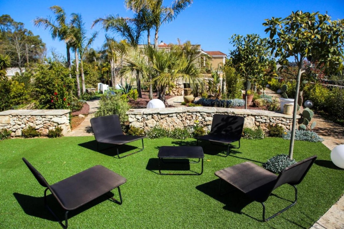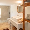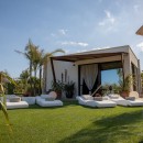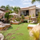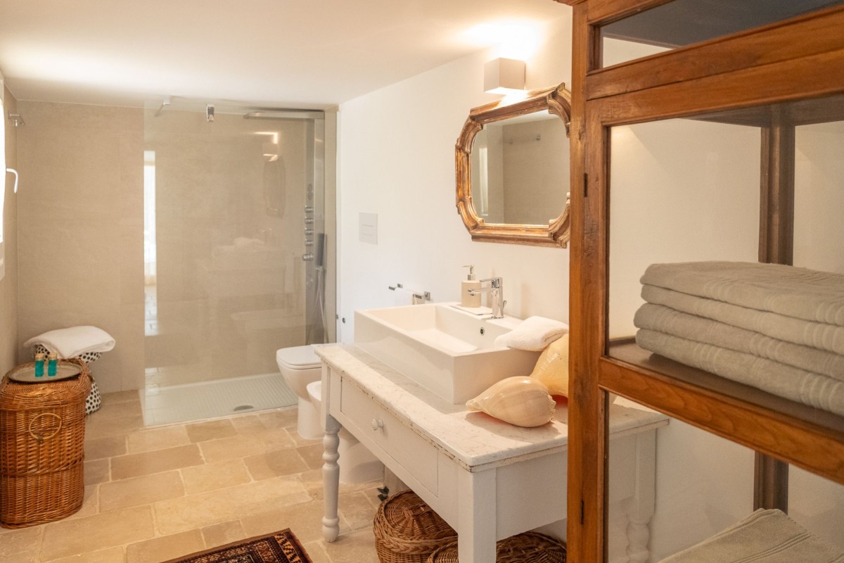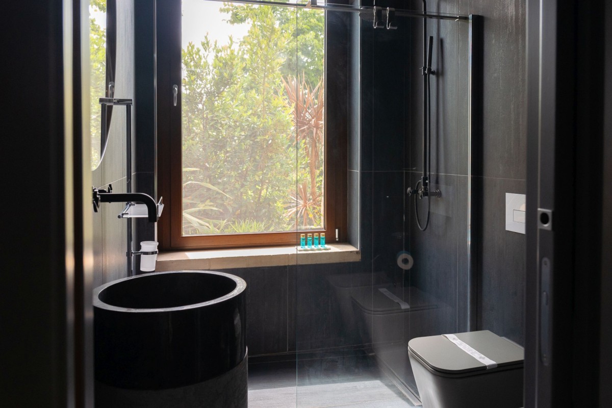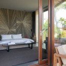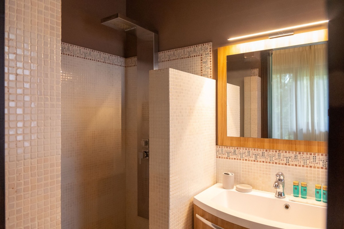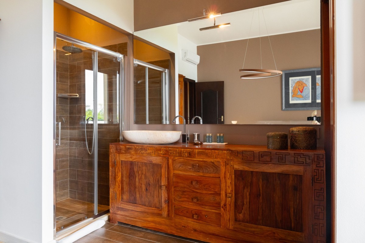 The external suite, located within the garden and separate from the villa, offers a private space complete with a sitting area and an ensuite bathroom with shower.