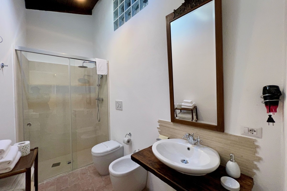 Recently renovated with a keen eye for detail, the villa blends the charm of traditional architecture with modern comforts. Its minimalist interior design, featuring a mix of contemporary and family-style furniture, fine fabrics, and carefully selected art pieces, gives the property a unique and welcoming atmosphere. Spanning across three levels, the villa is designed for ultimate relaxation and comfort. The first floor includes a cozy lounge with a fireplace, a formal dining room, a well-equipped kitchen, and a master bedroom with its own fireplace, en-suite shower, and Turkish bath. The second floor offers another double bedroom with an en-suite shower. On the ground floor, which is accessed externally, there are three additional bedrooms with en-suite showers, plus a suite with a double bed, a sofa bed, and an en-suite shower.