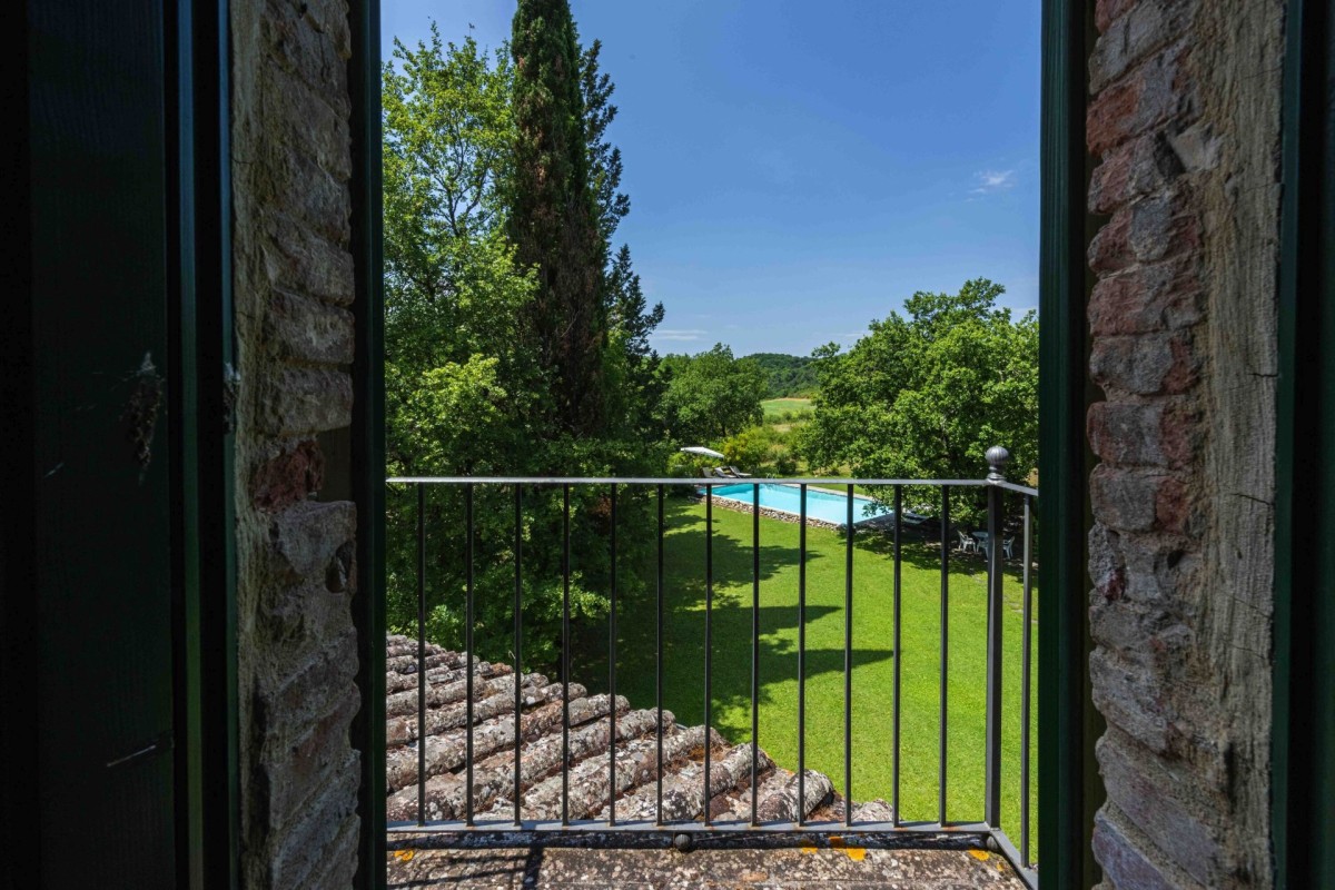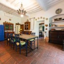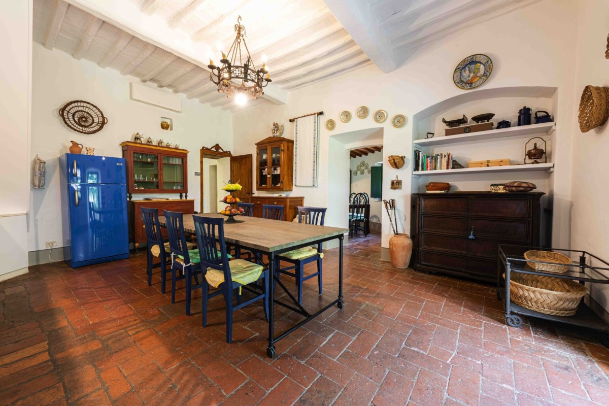 Encircled by centuries-old oaks, majestic cypresses, and rows of vineyards, the property features a large private garden with lawns, roses, hydrangeas, and aromatic plants. Two outdoor dining areas with umbrella and barbecue make it ideal for alfresco meals under the Tuscan sky.