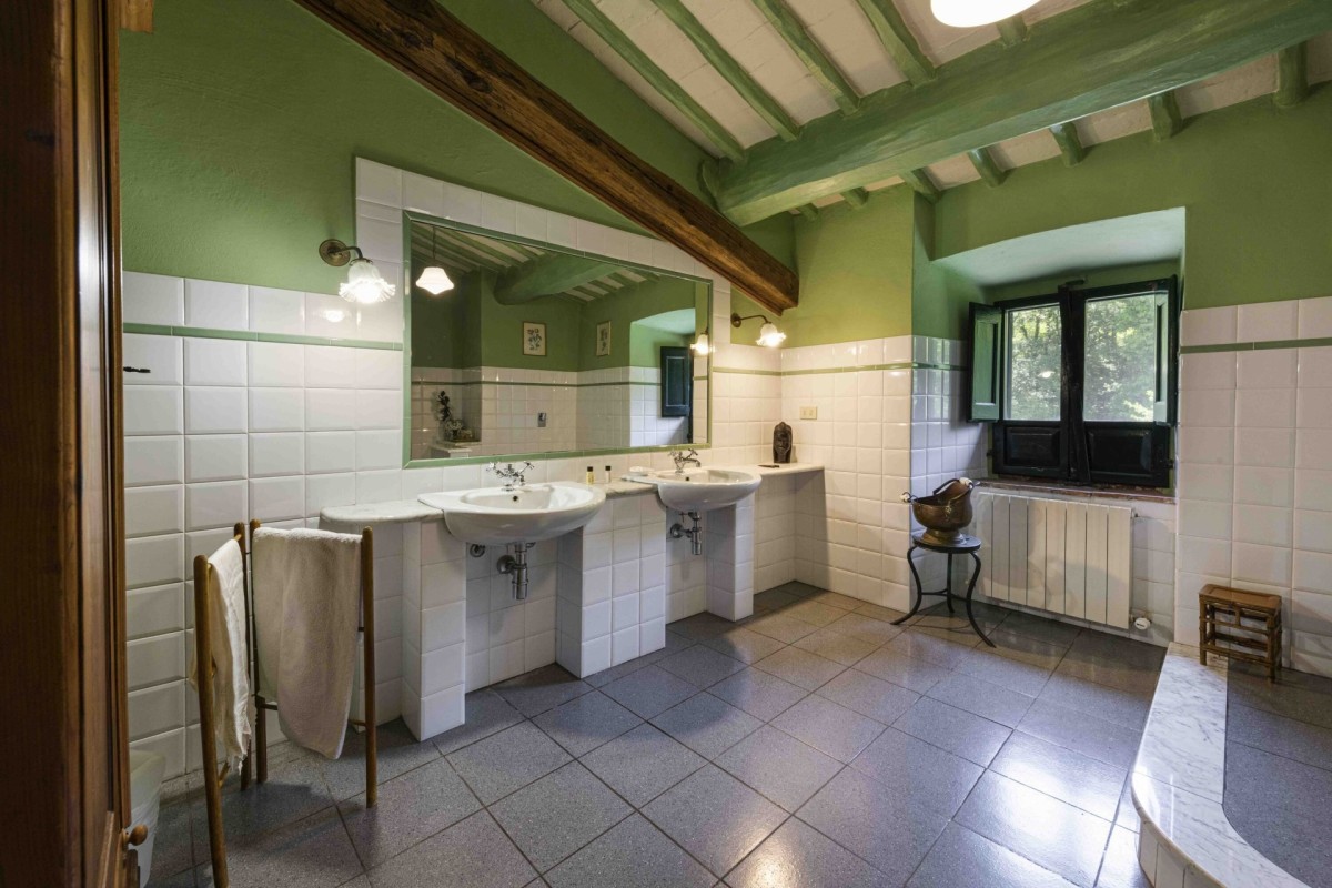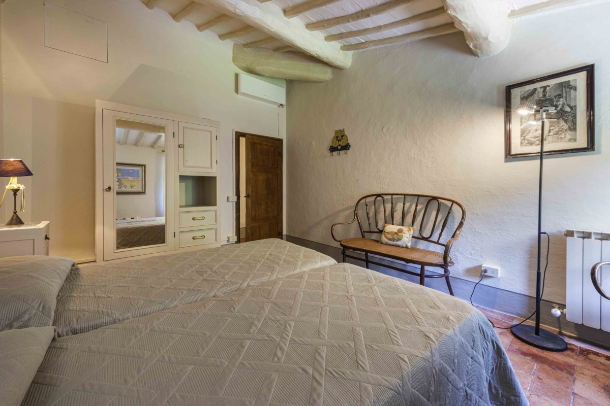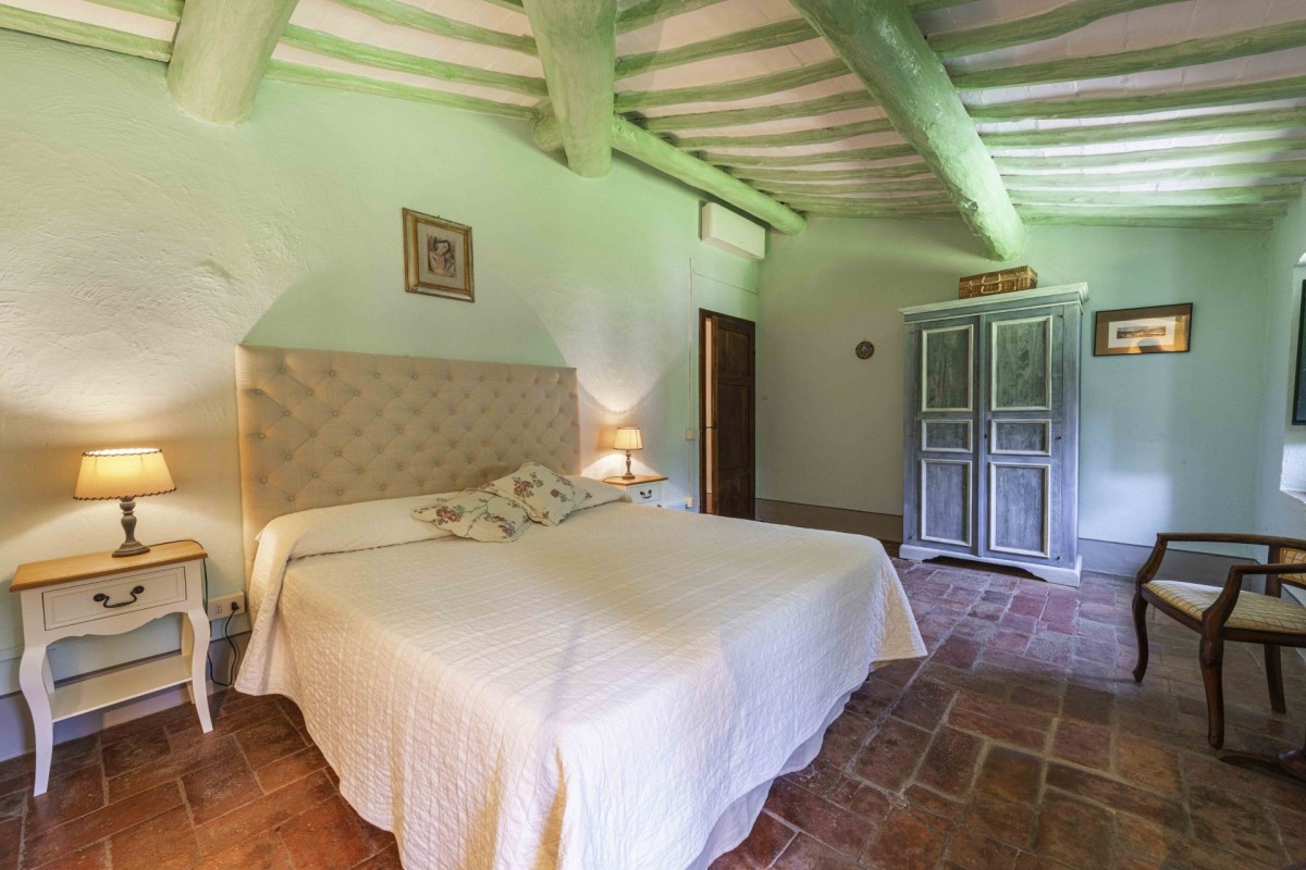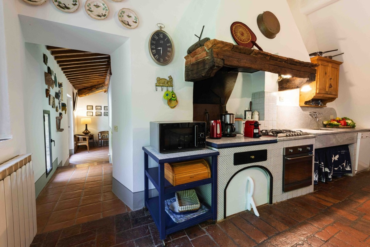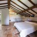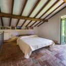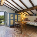 Once an ancient mill, the villa has been beautifully restored with exposed beams, terracotta floors, and stone walls, blending rustic charm with elegant furnishings. Inside, you’ll find spacious and bright living areas with sofas, a TV, piano, and dining room overlooking the pool. The kitchen is fully equipped and offers direct access to the garden. A laundry room is also available.