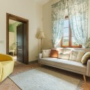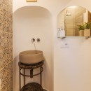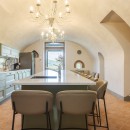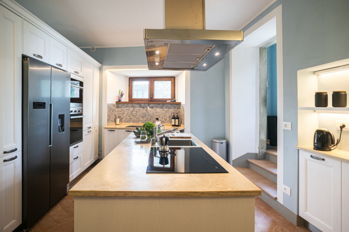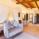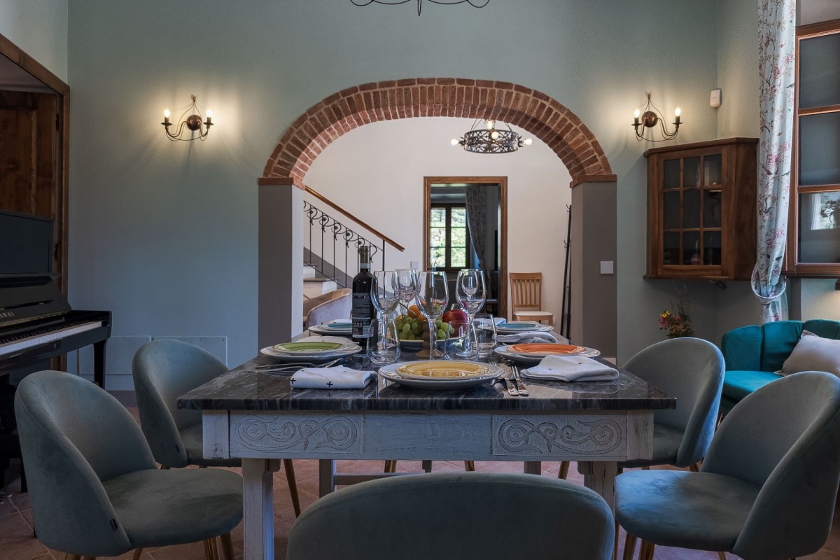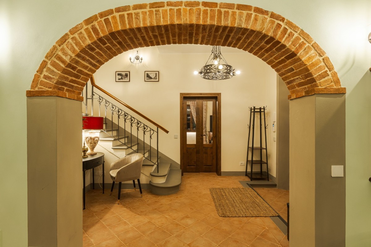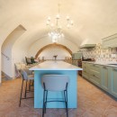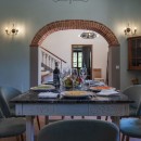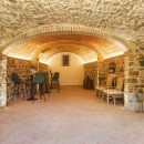 Inside, the ambiance is warm, elegant, and welcoming. Every suite has its own distinct palette and personality. At the same time, the shared living spaces feature a spacious kitchen, refined dining rooms, and cozy lounges ideal for gathering with family and friends. Beneath the original arches lies the cantina, a captivating setting for wine tastings or intimate dinners, filled with the aroma of oak and the quiet presence of history.