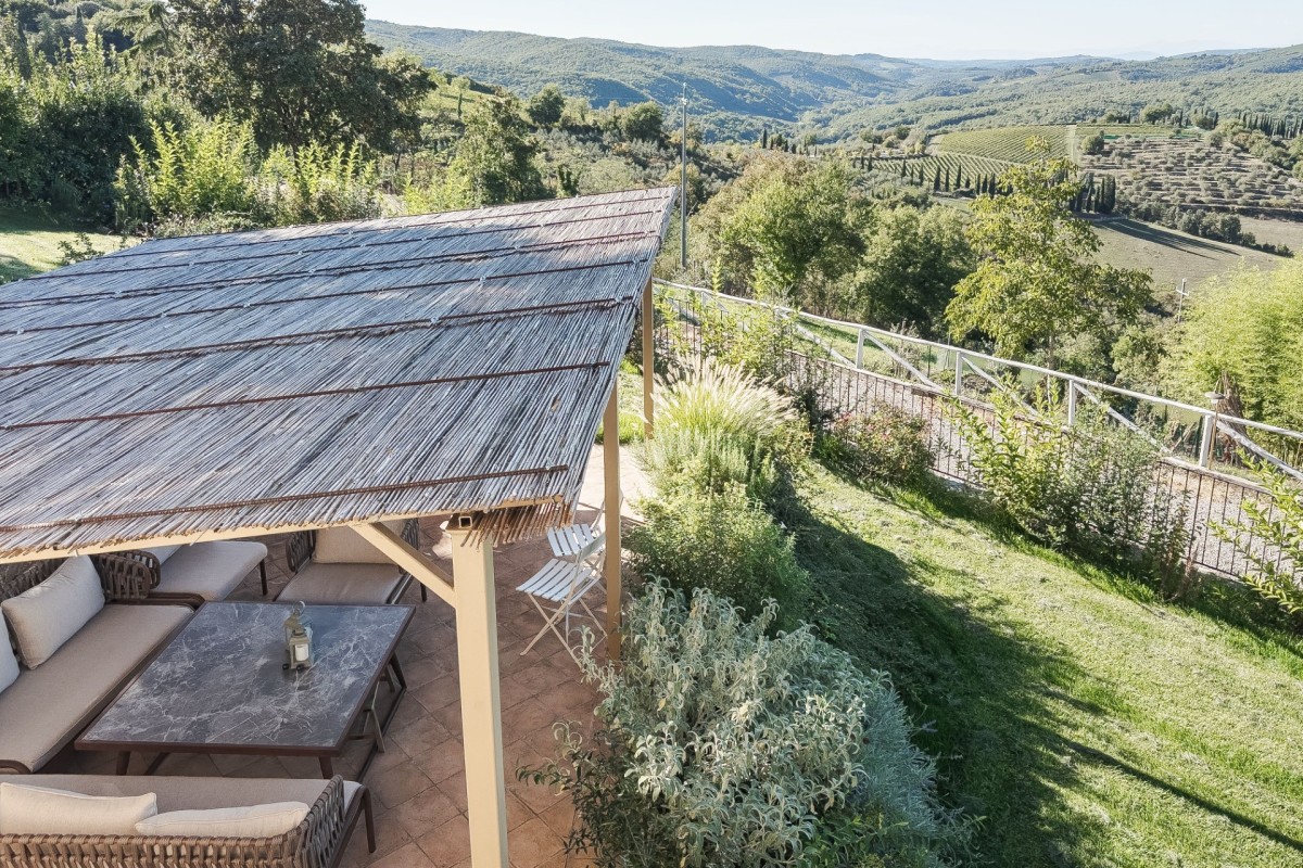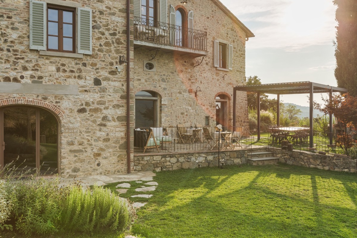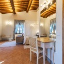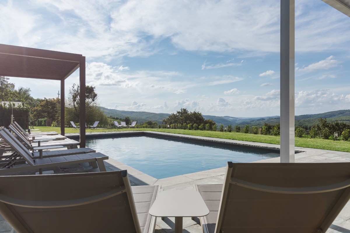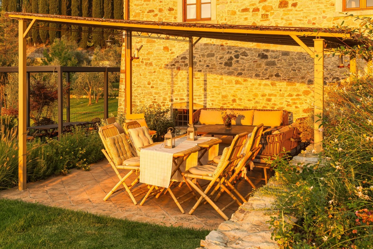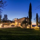 Set among rolling vineyards and olive groves, the villa was once a noble residence and an ancient watchtower during the historic conflicts between Siena and Florence. Today, it has been meticulously restored—almost entirely rebuilt—while remaining faithful to traditional Tuscan style. Stone exteriors, terracotta floors, and vaulted ceilings preserve its authentic character, seamlessly paired with modern comforts including underfloor heating and cooling, as well as a smart-home system.