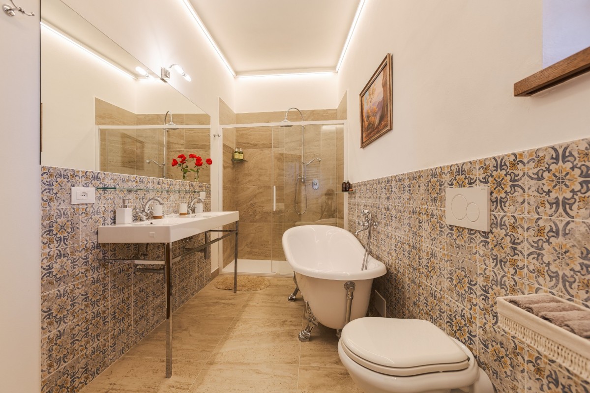 Bedroom 3: Camera Verde Bedroom with a queen-size bed, A/C, WiFi, garden view, and en-suite bathroom with bathtub, shower, vanity, bidet, and WC. 2 guests maximum.