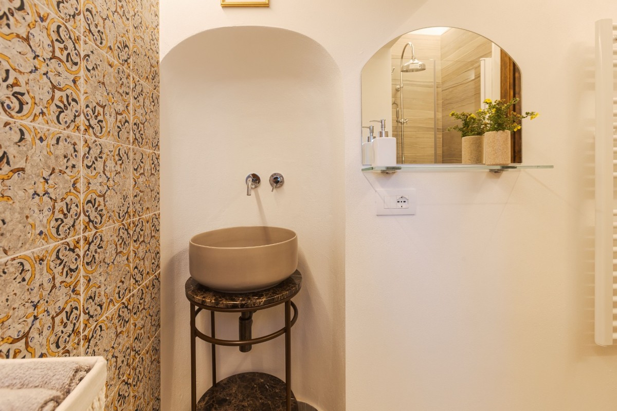 Bedroom 5: Camera Gialla Bedroom with a queen-size bed, A/C, WiFi, watchtower view, and en-suite bathroom with shower, vanity, and WC. 2 guests maximum.
