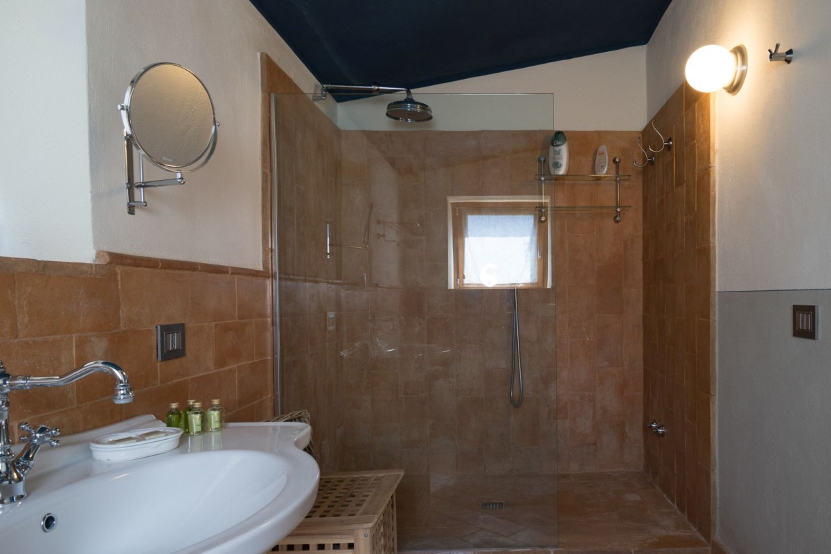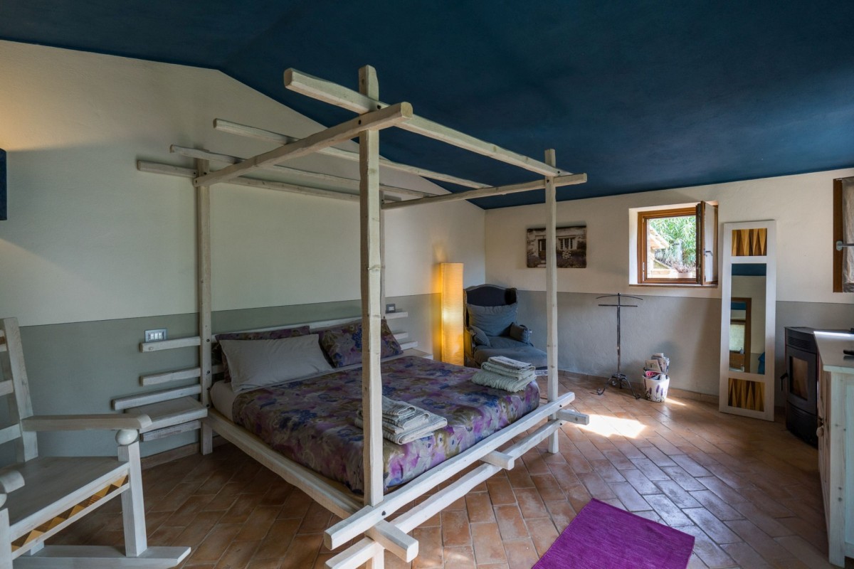 Bedroom 1: First floor bedroom with a double bed, WiFi, access to terrace, and shared bathroom with bathtub / shower, vanity, bidet, and WC. 2 guests maximum.