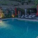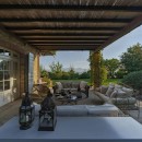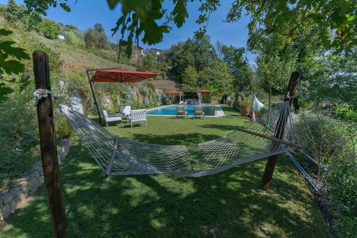 Surrounded by the green hills of Tuscany, the villa enjoys a panoramic position and a large private garden arranged on several levels. The grounds feature manicured lawns, citrus trees, aromatic plants, and flowers, creating a serene and colorful atmosphere. Within the garden, guests can relax on the patio with a lounge area and sofas, or enjoy outdoor meals on the veranda. A higher terrace offers breathtaking countryside views, while a charming glass annex provides a peaceful space for reading, yoga, or painting.
