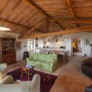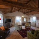 Inside, the villa offers a warm and welcoming atmosphere. The upper floor features a spacious, bright living area with comfortable seating, a fireplace, a TV, and a dining table. The adjoining kitchen is fully equipped with an oven, stove, toaster, refrigerator, coffee machine, dishwasher, and microwave, ensuring guests have everything they need for a pleasant stay.