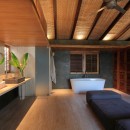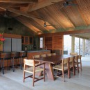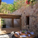 The first house offers three bedrooms: two with en-suite bathrooms, each equipped with two double beds and two single mattresses, and one bedroom featuring a double bed and two single beds. The open-plan living and dining room includes a fully equipped kitchen and a guest bathroom. Two outdoor terraces invite guests to relax, while an outdoor hot tub and pool add to the luxury. A snack area by the pool and laundry and kitchen services round out the amenities.
