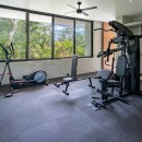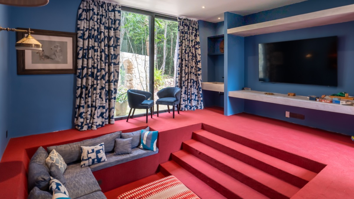 Stay active in the private gym, or unwind in the sunken media room, complete with plush seating for ten guests and a 100-inch TV—perfect for cozy movie nights or leisurely downtime.