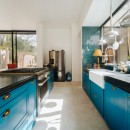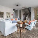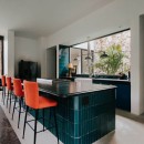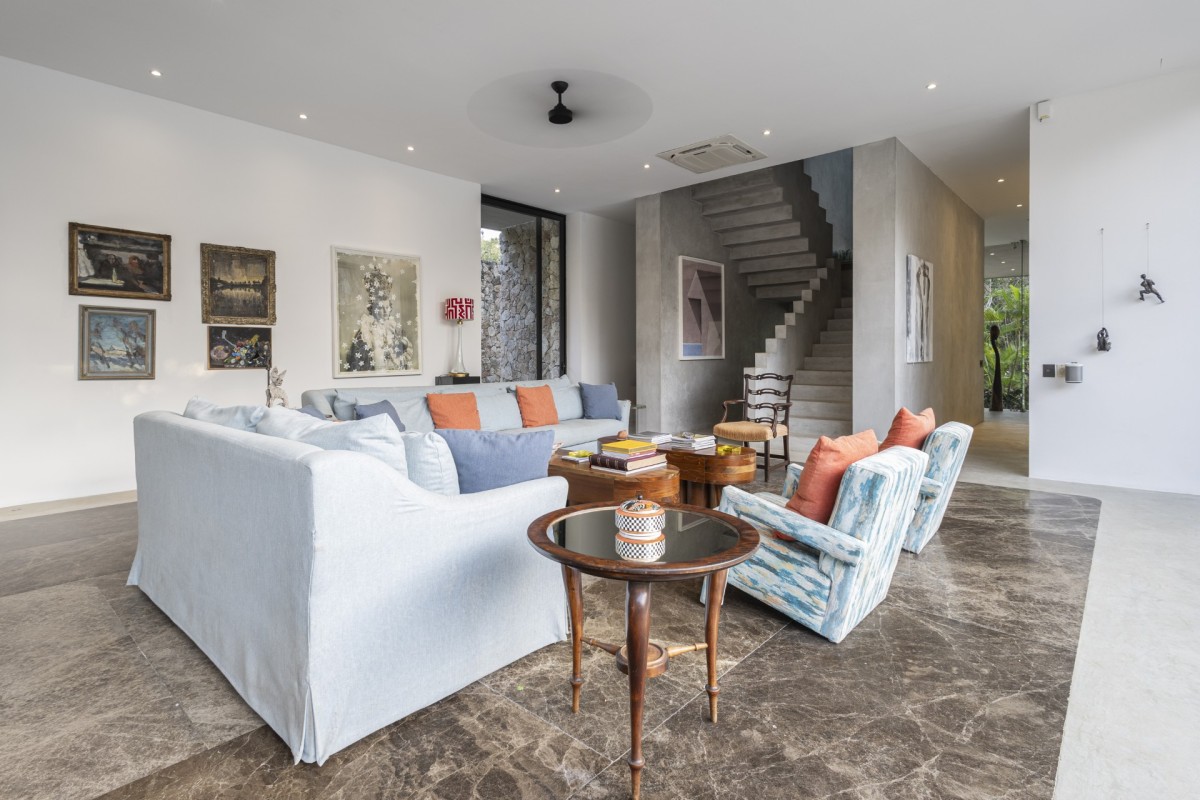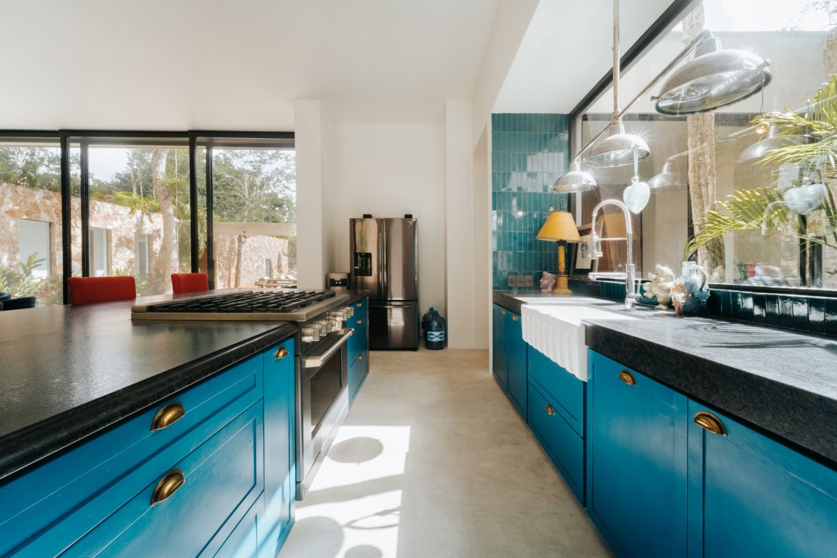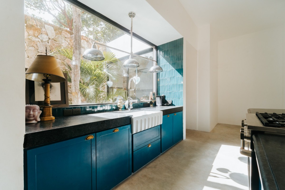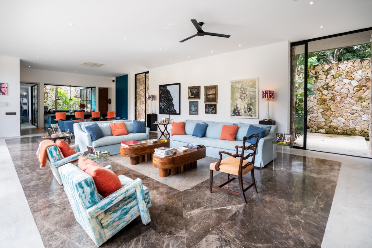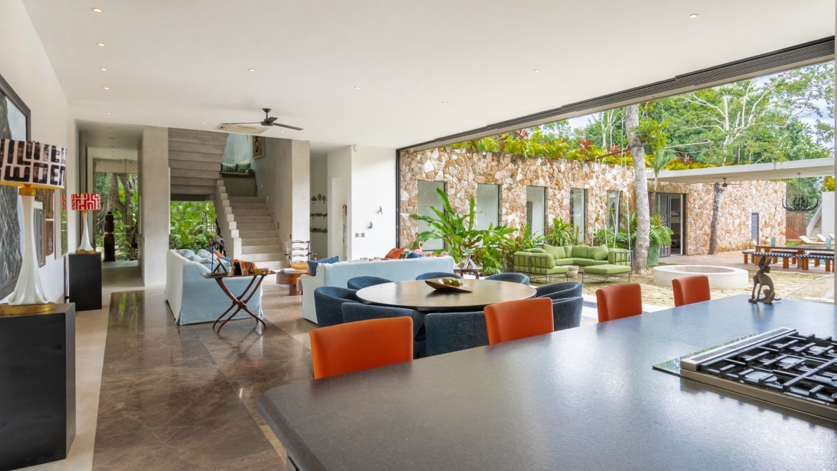 At the heart of Casa Xolo lies an expansive open-concept living area seamlessly connected to a modern, chef-inspired kitchen with top-of-the-line appliances. A separate staff kitchen allows for both intimate, catered dining experiences and relaxed gatherings with friends.