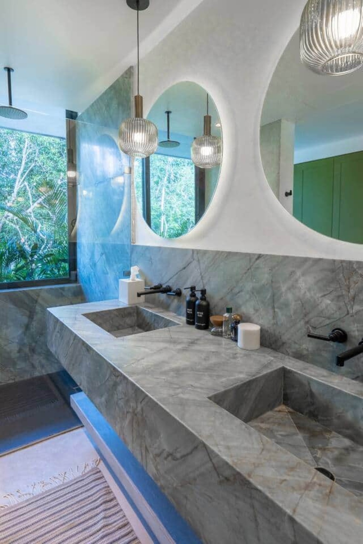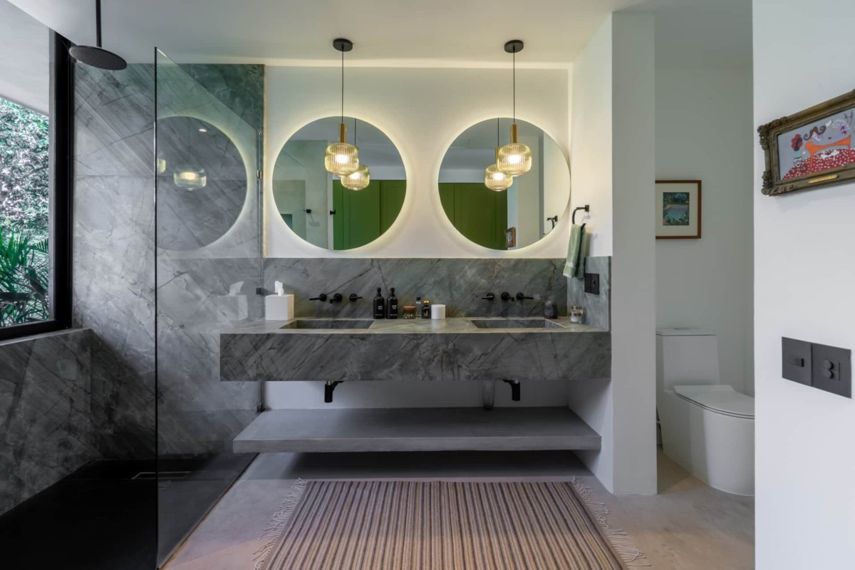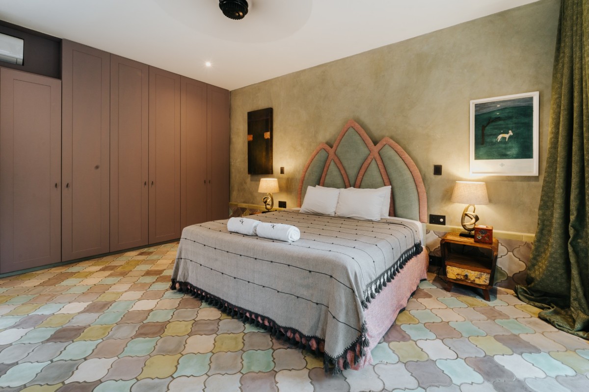 The main villa features three spacious primary bedrooms, each with its own ensuite bathroom, while the guest house offers two additional ensuite bedrooms, ensuring comfort and privacy for every guest.